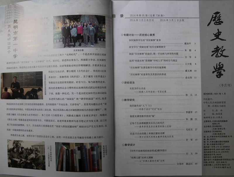 中文社会科学引文索引(CSSCI)来源期刊、全国中文核心期刊、中国人文社会科学核心期刊,在学术界和中学历史教学界有较高影响力、最具权威性的历史教学类杂志《历史教学》2016年3月上半月刊封二位置报道我校历史教研组。