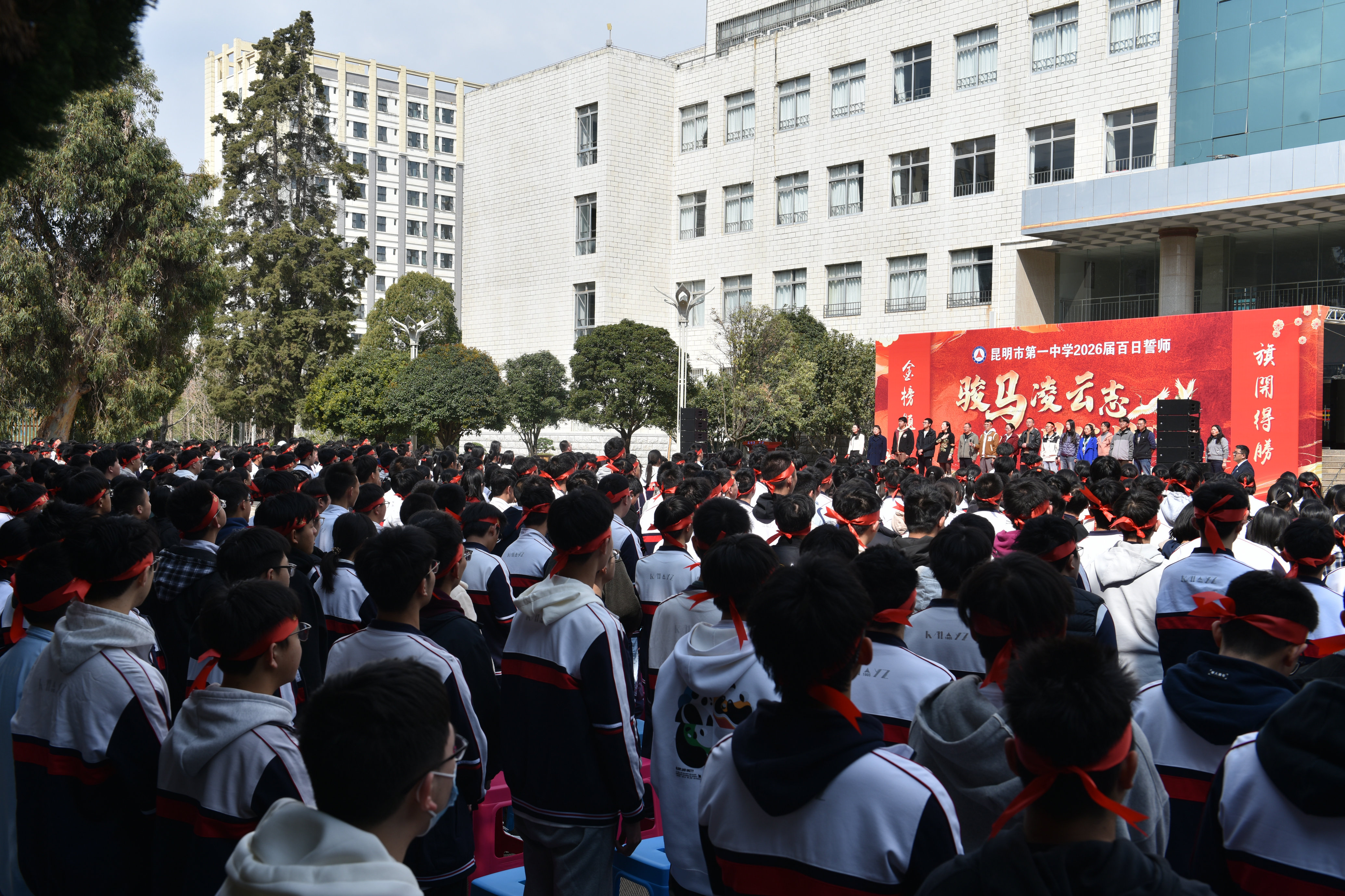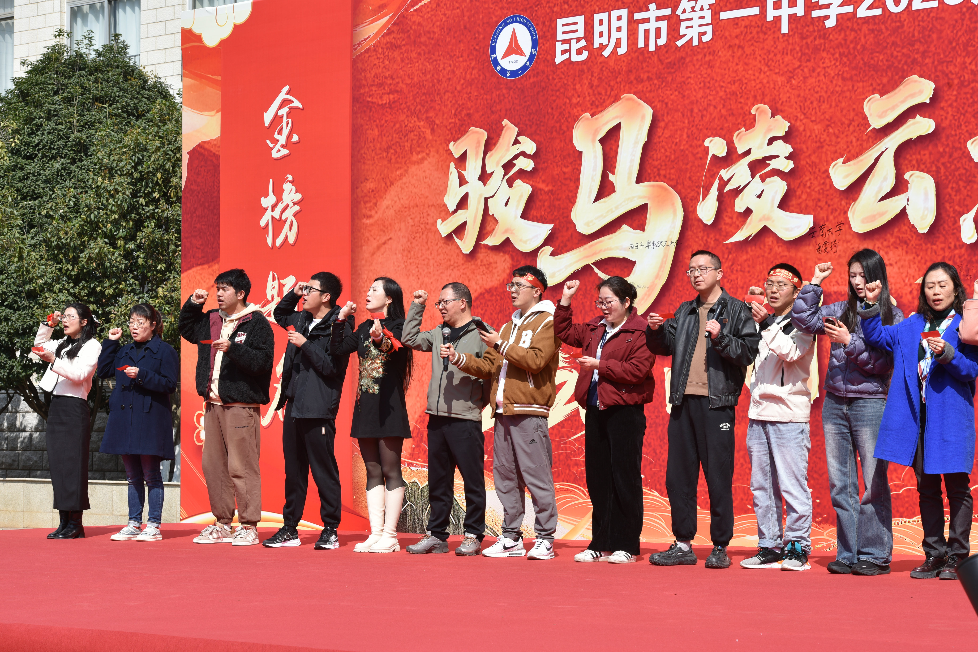 随后,高三班主任们登台,带领2026届高三学子庄严宣誓:“心怀凌云志,不负少年时。不负父母期盼,不负恩师教诲,不负青春理想,不负百日时光。珍惜一百天,让汗水孕育不凡;奋斗一百天,用信念铸就灿烂;拼搏一百天,凭实力实现梦想!”高昂的誓言余音未散,同学们齐声唱响昆华校歌:“练好我们的心,练好我们的身,此心此身,成己成人!”这正是昆华学子应始终恪守的昆华精神。