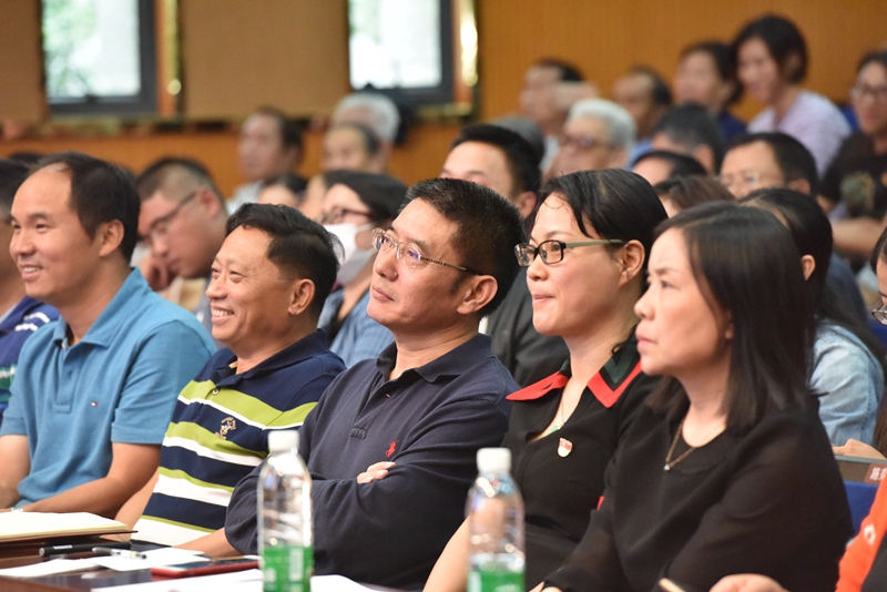 随后,由省委宣讲团成员、云南省委党校副校长欧黎明教授作题为《习近平新时代中国特色社会主义思想》的报告会。欧教授紧紧围绕习近平新时代中国特色社会主义思想的形成发展、核心内容、核心要义、精髓四个方面阐述了习近平新时代中国特色社会主义思想这一主题。欧教授旁征博引、风趣幽默,用生动的案例、透彻的分析,从身边切实可感的或细微或巨大的现实变化,向我们揭示了新时代是中华民族从站起来、富起来到强起来的伟大飞跃。欧教授强调,学习习近平新时代中国特色社会主义思想,要在领会基本内容的同时,深入理解和掌握贯穿其中的精髓要义,习近平新时代中国特色社会主义思想的精髓,就是为人民谋幸福、为民族谋复兴、为世界作贡献,这集中反映了当代中国共产党人的人民立场、民族抱负、世界立场。在谈到“四个自信”尤其是文化自信时,欧教授对这一更基本、更深沉、更持久的力量深有感触,也对基层学校在立德树人中不断树立学生的文化自信,强化文化担当寄予了厚望。