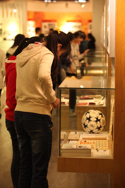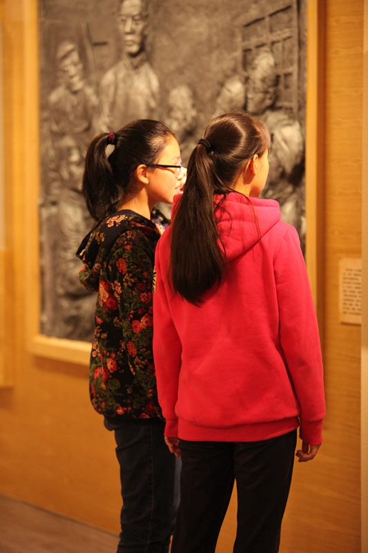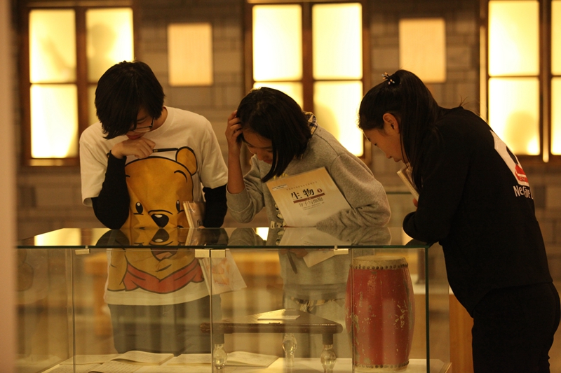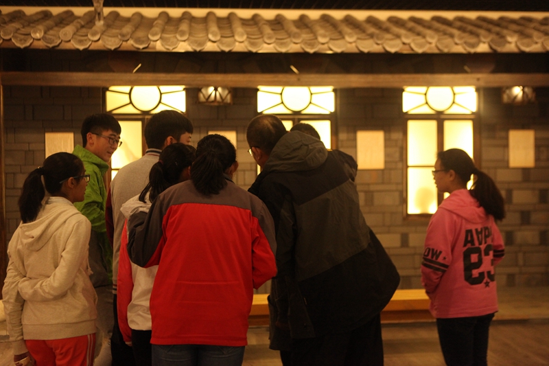 在照片的顶侧,就是校史馆透过日光下的影子,所重现的一幅教学场景,一位短发披肩的年轻女教师,手拿粉笔,正望着她的学生,也许正在询问问题吧,所能看见的,三两个学中一个正在端坐倾听,而另一个则高举着小手,将自己代入这样和谐的场景,让我感受到了浓浓的温暖。