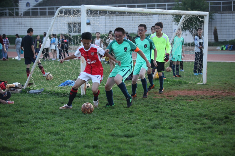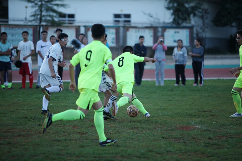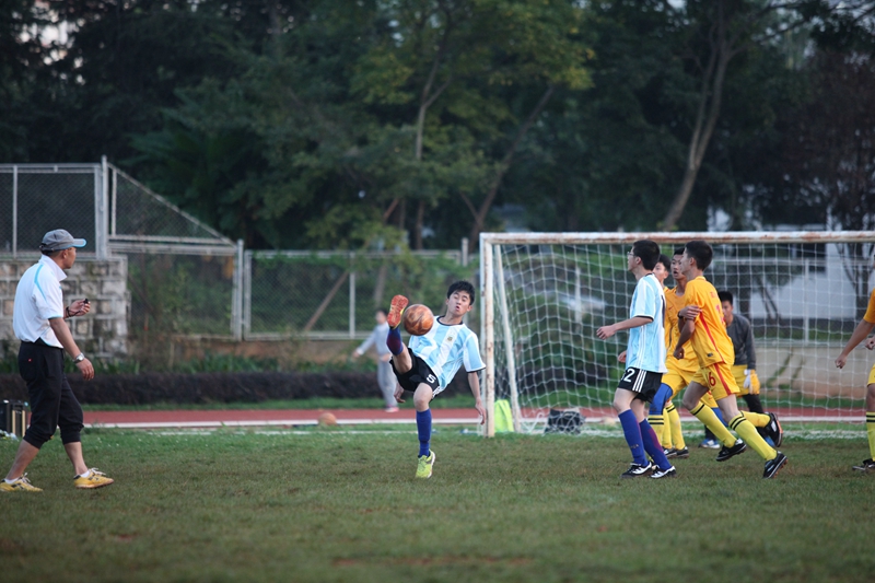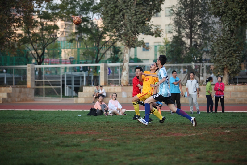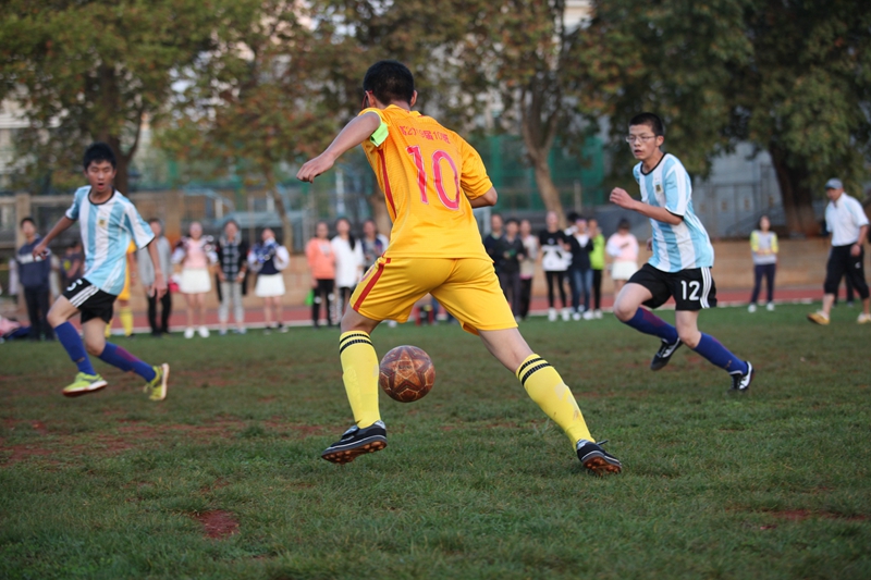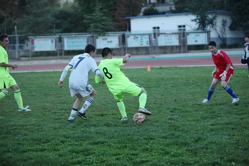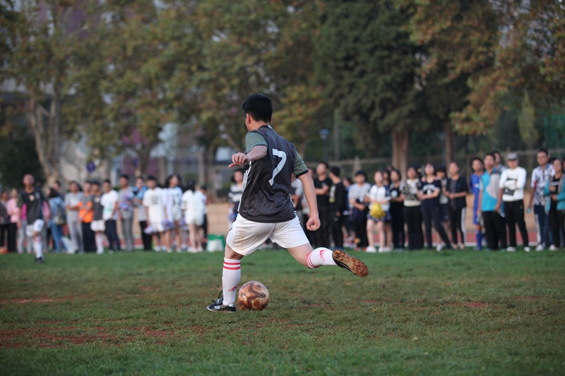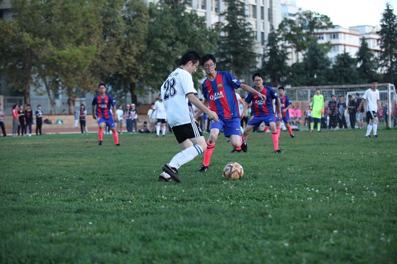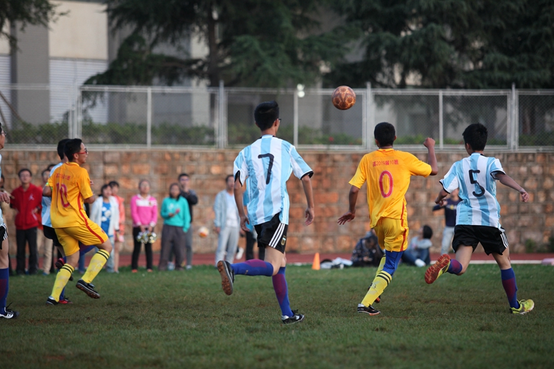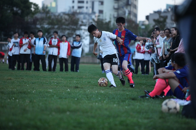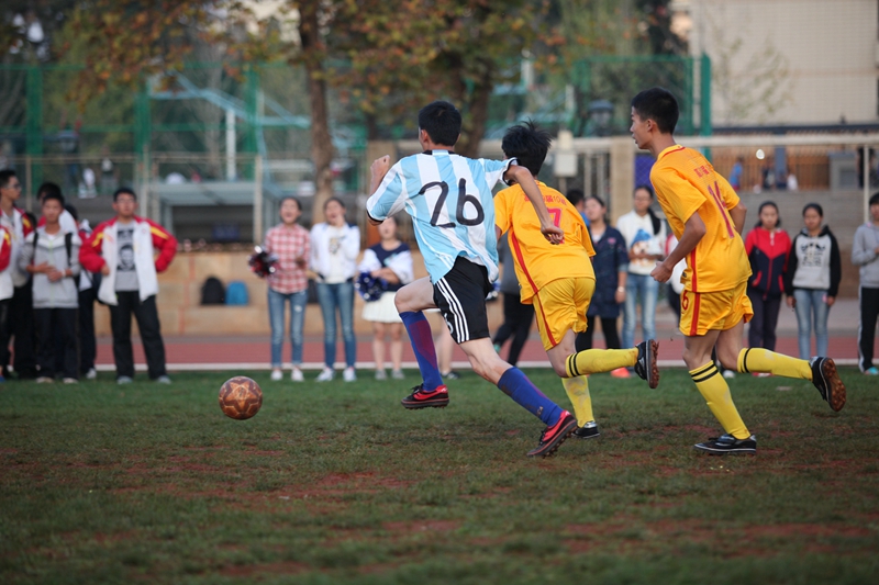 夕阳抚过金黄的树叶,留下树影斑驳。斑驳树影旁,时有身影疾驰而过,那正是绿茵场上奔跑的少年。尽管训练时间紧迫,肩负赢得班级荣誉的重任,队员们依旧从容不迫。赛前,留给同学们的,是他们坚定的背影。