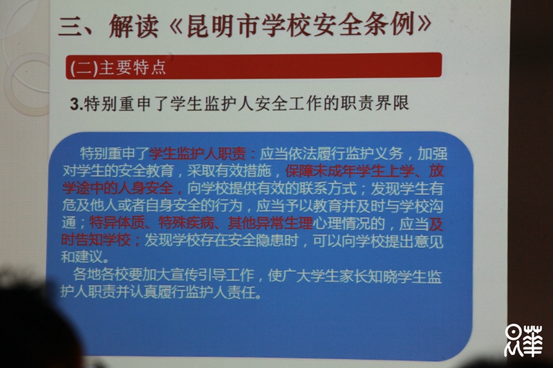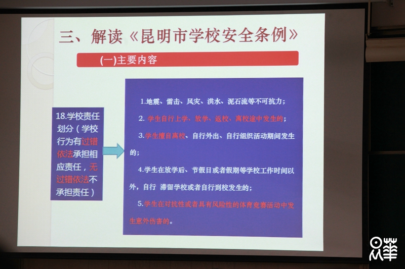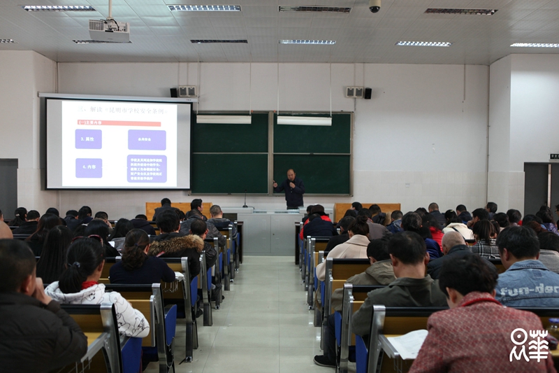 2月28日下午,我校邀请昆明市教育局资玉国调研员为全体教师解读《昆明市校园安全条例》。培训会由行政副校长、党委副书记兼纪委书记李品江主持。经昆明市第十三届人民代表大会常务委员会第四十次会议审议通过,云南省第十二届人大常委会第三十一次会议批准,1月12日,昆明市人大常委会公布了《昆明市学校安全条例》,并于3月1日起正式执行。《昆明市学校安全条例》明确了学校安全的属性及适用范围,进一步从学校安全责任、学生及其监护人责任、法律责任等几个部分规定了社会各方面对于学校安全工作的职责,完善了事故纠纷调处机制,重申了学生监护人的职责界限,推动“校闹”处置法治化。今后《昆明市学校安全条例》将作为学校安全管理的重要依据来贯彻执行。资玉国调研员重点强调了在学校安全工作中,学校应当履行的制定突发事件应急预案,定期组织师生开展多种形式的应急培训和演练;开展学生安全教育、心理健康教育,提高学生自我防护和自救互救能力;定期开展校园安全检查,维护校舍、场地、设施设备,及时消除安全隐患等职责。通过地方立法,《昆明市学校安全条例》明确规定了学校应当承担“依法承担责任、行为有过错承担责任、行为无过错依法不承担责任”等几种责任情况,并建立事故纠纷调处机制。