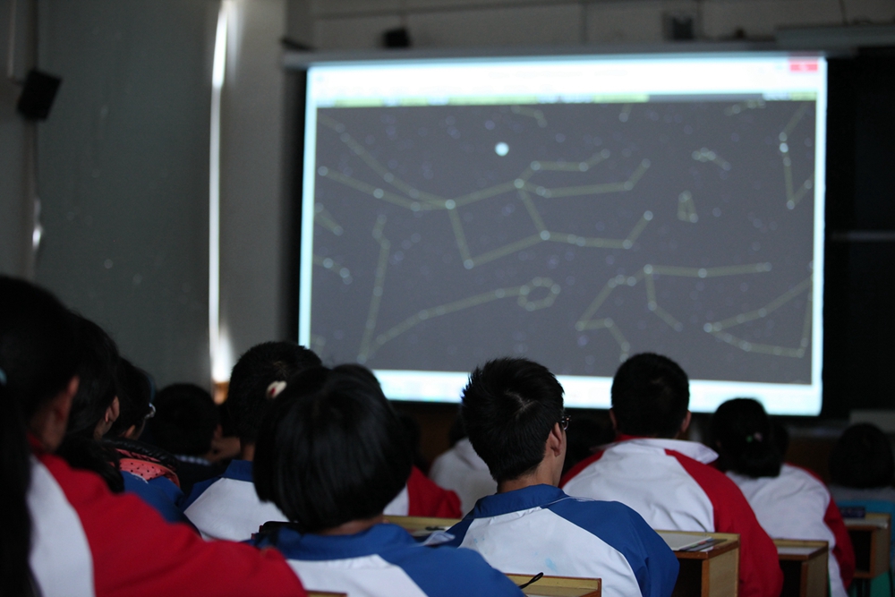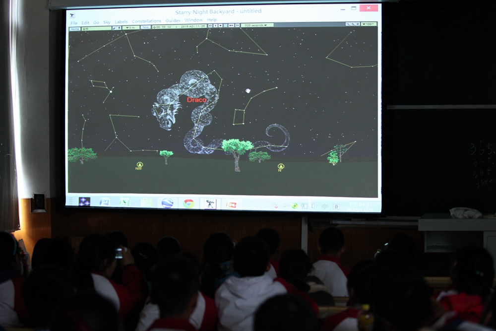 同学们在杨老师的带领下认识星座。高傲的人马座,展翅翱翔的天鹰座,仰天长啸的天龙座,猎手座跨过世界的彼端。