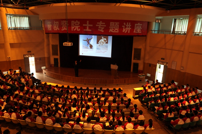 “同学们要敢想、敢问、敢答。”讲座一开始,唐院士便给同学们提了个要求,这让原本有些拘谨的同学们轻松起来。“同学们,你们想体验飞翔的感觉吗?”这一引人无限遐想的问题提起了全场的兴趣。以此为起点,唐院士带领同学们走进了牛顿、爱因斯坦等大师构建的物理世界。一个个问题与一次次回答迸发出思维的火花,越来越多的同学参与到问答中来,气氛也越来越高涨。唐院士形象的比喻与风趣的讲解,同学们听得津津有味,不时发出几声惊叹。唐院士让同学们自己推导气体压强的过程则把演讲推向了高潮,在推导过程中,他耐心纠正同学们的错误,并肯定合理之处,在他的循循善诱之下,同学们一步一步朝着正确答案前进,最终成功推导出公式的同学也获得了唐院士的赞扬和全场热烈的掌声。快乐的时光总是短暂,在思考与交流中,讲座也到了尾声。唐院士用风趣幽默的语言给同学们展示了一个奇妙五彩的物理世界,让我们领略了院士的风采,也让我们明白在学习之路上,唯有不断思考与探索,方能成功。