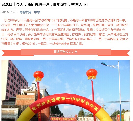 母校109岁了!不是每一所学校都有109年的历史,不是每一所有109年历史的学校都叫昆一中。在这里,我们度过了人生的黄金时代,一千多个闪耀的日子。昆华园,是我们甫一离开,就开始怀念的地方。想说,其实我们从未走远,心一直朝向您的所在跳动。昆华,汝安好否?九年前的今日,母校百年华诞,多少昆华学子何其有幸躬逢其盛,亦或许,我们迟来,错过,只来得及在远方注视。就在明年,母校将迎来一百一十周年华诞。百年校庆时你在哪里,一百一十年校庆你又将在哪里?约吧,相约2015,一起回,一场说走就走的回家之旅。