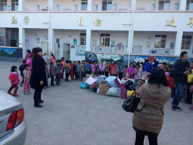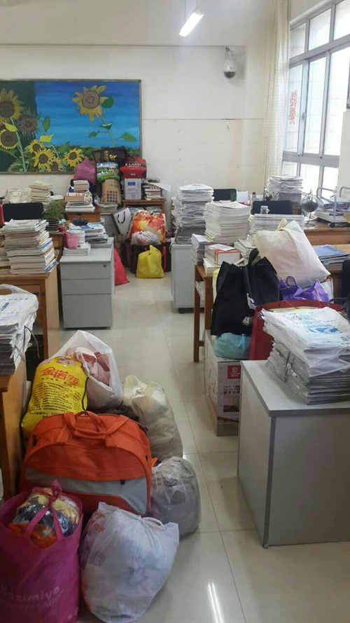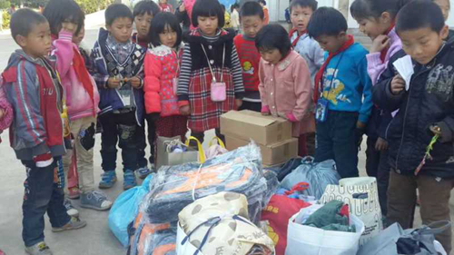 2014年12月24日,我校高一年级部分教师带着学校师生捐赠的旧衣物到富民县赤就中学和赤就中心小学开展献爱心活动。同时,老师们还自发捐款资助赤就中学的一名苗族学生,并对其给予鼓励。这是我校教师第五次到富民县献爱心。第一次是2013年1月到赤就小学捐书物;第二次是2013年2月到赤就乡白龙水井苗寨捐物;第三次是2013年5月到赤就中学捐书;第四次是到赤就乡磨丹小学捐物,赤就中学捐书。 师生捐赠的衣物堆满了教师办公室 盛情满满 这个冬天,多了一分温暖