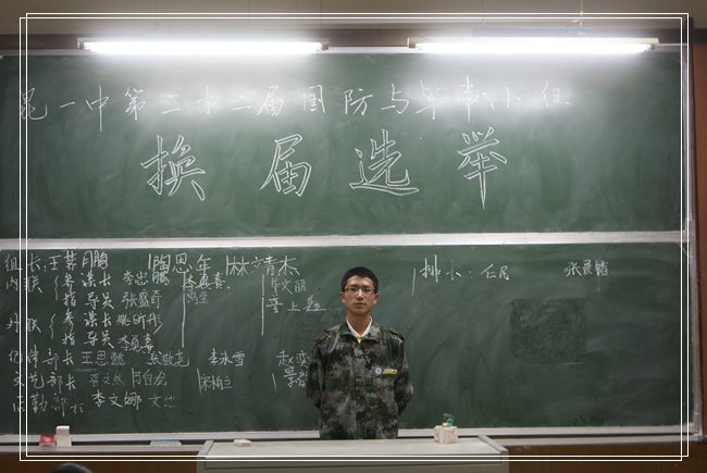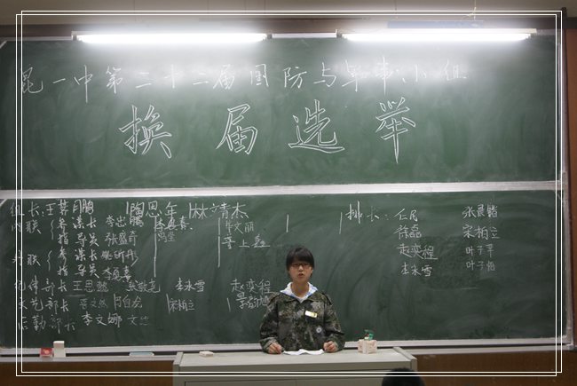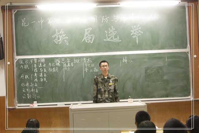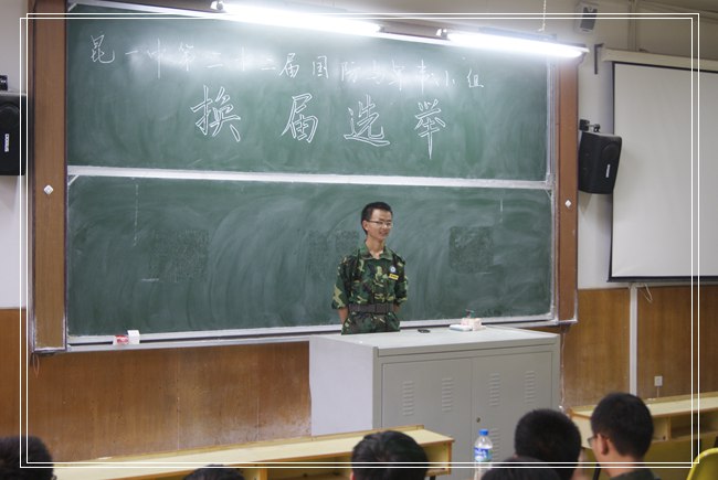 (文:张浩 图:张浩 王俊懿 王倡剑)2014年5月23日晚,昆一中国防与军事组第二十二届换届选举于科技楼多媒体教室举行。在第二十二届参谋部的组织下,军事组2016届成员选举出了第二十三届领导人。候选人通过演讲、答辩阐述了对军事组的热爱之情,以及对军事组未来发展的看法,精彩的回答博得了大家的阵阵掌声。军事组自1992年成立以来,每一届领导人的选拔均是通过民主选举进行,通过对候选人的出勤考察、思想考察,确定候选人,并在选举前一周进行自我介绍,让每一位军事组的成员对候选人都有一定的了解。在换届选举后,新当选的领导人将在上一届全体成员的指导下组织进行本学期剩余时间的正常活动,为明年迎接新一届军事组新成员做准备。