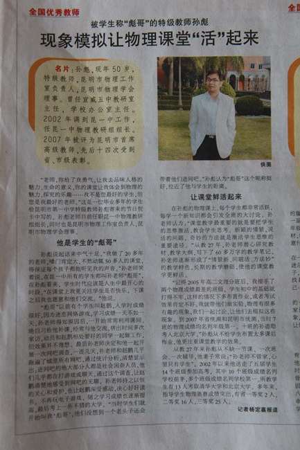 《昆明日报——教育周刊》报道我校全国优秀教师孙彪:
