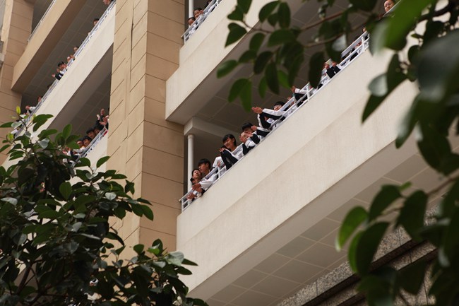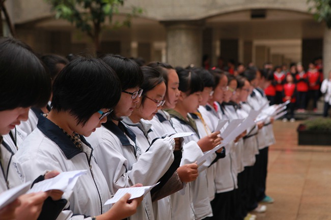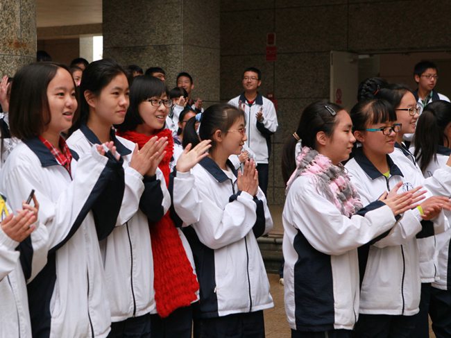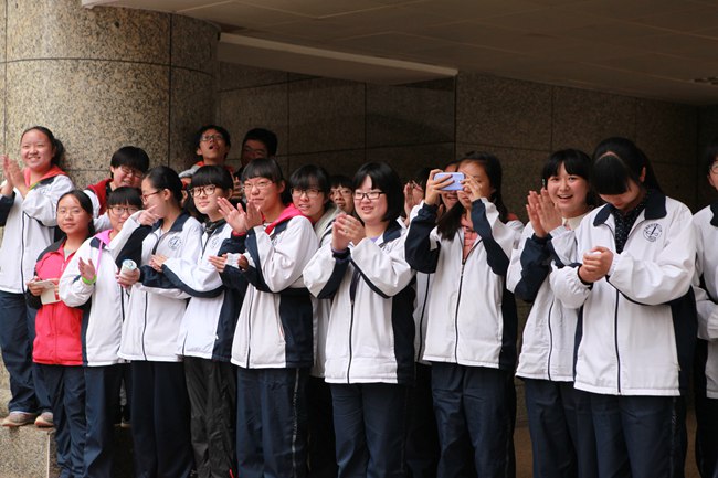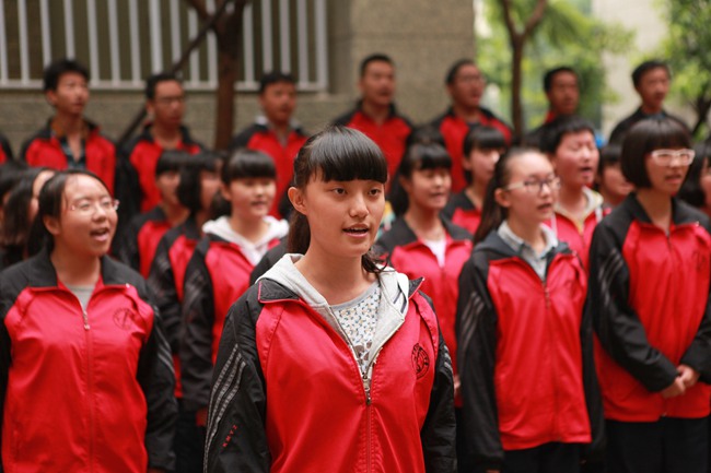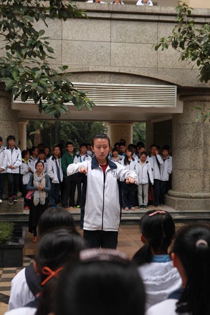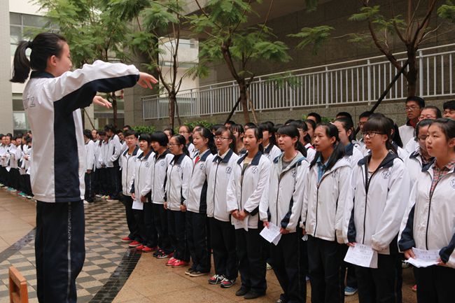 2014年9月25日课间操时间,高2016届在教学楼前的空地上举行了“不插电演唱会”——“歌唱祖国”歌咏比赛。虽然没有华丽的舞台,可是同学们热情不减,五个文科班率先表演,先后唱响了《打起手鼓,唱起歌》、《十送红军》、《北京欢迎你》、《歌唱祖国》等一首首经典歌曲。教学楼楼道天然地成为观看演出的最佳位置,同学们纷纷为文科班的精彩演出热烈地为鼓掌、呐喊。