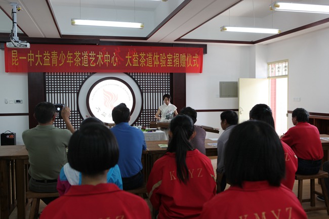 2014年9月28日下午,昆一中大益青少年茶道艺术中心暨大益茶道体验室捐赠仪式举行。赵灿东校长在致辞中表示,感谢大益基金会以及大益茶道院对昆一中的关爱和支持。昆一中一贯倡导学生的全面发展,茶道艺术中心的落成将为学生发展爱好创造良好的条件。茶文化源远流长,我校将把“青少年茶道课程”作为校本课程开设,让学生在此过程中学习茶的文化、水的文化。在茶道的学习中,感悟和回味中国文化,捧一杯清茶,品一卷诗书。大益爱心基金会领导李占文发言说,百年历史名校见证了大益茶第一所青少年茶道艺术中心的落成。茶文化是中国文化独特的文化符号,在高中生中开展茶道的学习、宣传,希望茶文化这片美丽的叶子发扬光大。赵灿东校长和大益爱心基金会领导共同为大益青少年茶道艺术中心、大益茶道体验室揭牌。大益茶道院“青少年茶道课程”授课教师杨明容老师向我校赠送相关文化书籍。在清丽的古筝演奏中,大益茶道院老师进行了“大益八式”茶道表演。杨明容老师还现场指导三位同学体验了茶器的使用、如何行茶礼。