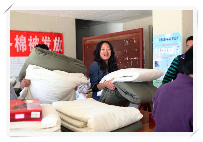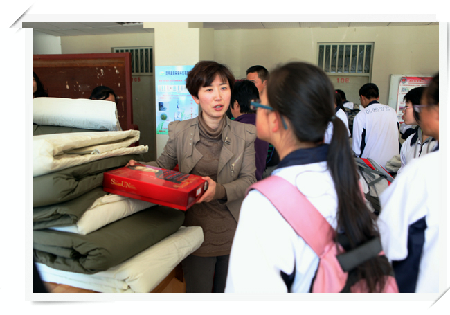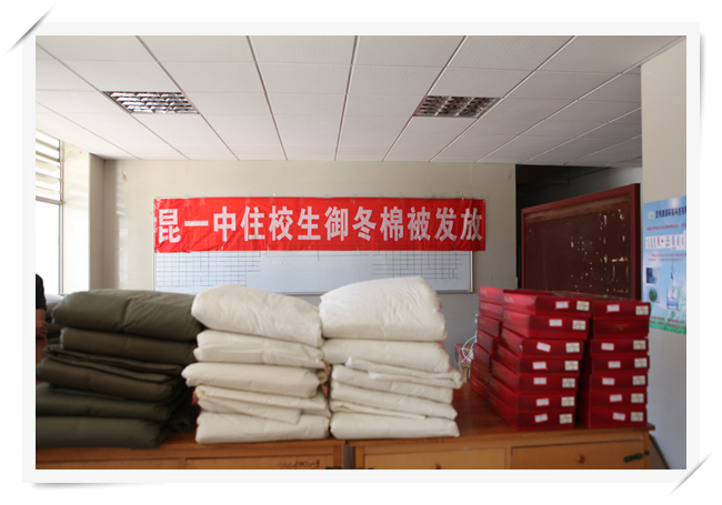 2013年11月13日中午,学校女生公寓一楼大厅,整齐地堆放着棉被、褥子、保暖内衣。这是昆一中一年一度举行的为贫困学子发放御冬物品。经过生活老师的认真调查了解,学生工作处审核,来自2016届的57位同学,领到了一床被子、一床褥子、一套保暖内衣。为了让同学们拿到的保暖内内衣合身舒适,学生工作处事先统计了同学们的身高,这样的贴心之举无疑让同学们感受到了更多的温暖。
