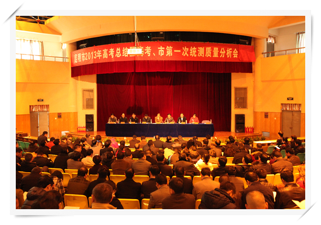 2013年12月10日,昆明市2013年高考总结暨高考、市第一次统测质量分析会在我校报告厅举行。市教育局穆仁早副局长总结了2013年高考所取得的成效,并提出了各学校要继续加强课堂研究等工作建议。市教育局纪委鲁再国书记宣读了市教育局对2013年高考质量优秀学校进行表彰的决定,我校喜获2013年高考一本上线率优秀奖。最后市教育局刘绍安局长发表重要讲话,强调各学校要坚持以教育质量为中心,树立素质教育综合质量的意识,分析不足,有所改进和提高。