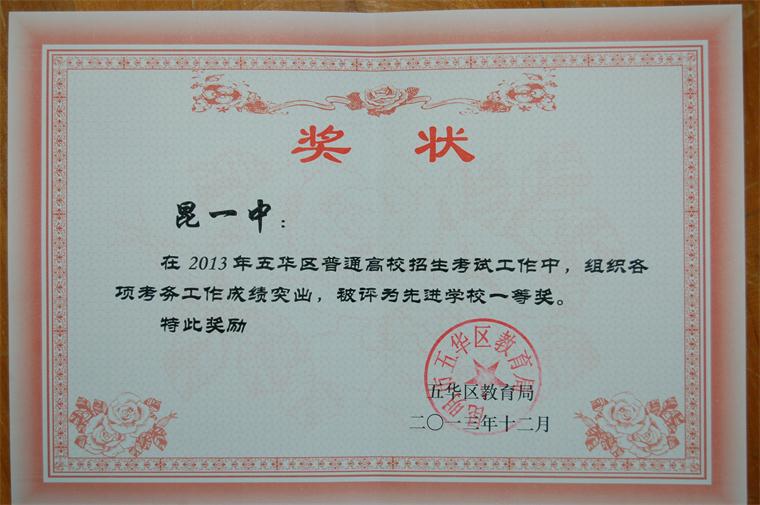 由于昆一中在2013年五华区普通高校招生工作中组织各项考务工作成绩突出,被五华区教育局评为先进学校一等奖。