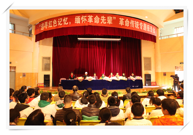 2013年12月25日下午,开国大将陈赓之女陈知进、开国上将朱良才之女朱筱秋、开国上将邓华之女邓英、开国上将杨至成之子杨珠江、开国中将张南生之子张雁之、开国少将吴岱之子吴志民等将门之后联袂为高一学生带来了一场“追寻红色记忆,缅怀革命先烈”的革命传统教育专题报告会。将军子女分别和同学们分享了一个个父辈们的小故事:陈赓大将对红军十周年纪念章的钟爱;杨至成将军克服困难超额完成征粮任务;朱良才将军淡泊名利,放弃对《朱德的扁担》一文的署名,只求光荣的革命传统能够发扬光大;邓华将军在人生十字路口,坚定地选择了继续为人民战斗。一个个故事让同学们重温将军们走过的峥嵘岁月,他们崇高的身影宛在目前,战争的烽烟虽已远去,但革命先烈对于民族新生所付出的心血和牺牲深深震撼和感动了同学们。