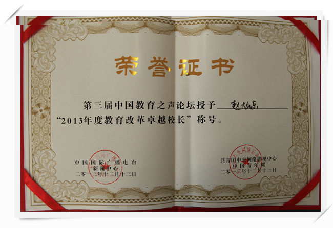 由中国国际广播电台新闻中心、共青团中央网络影视中心、中国青年网、中国教育之声网联合主办,清华大学教育研究院、北京市朝阳区教育委员会协办的“第三届中国教育之声论坛暨教育改革家年度盛典”授予我校赵灿东校长“教育改革卓越校长”称号。