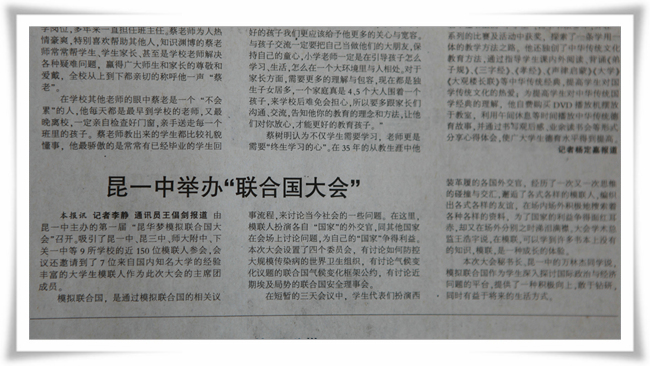 2013年10月11日出版的《昆明日报》12版《大周末•教育》聚焦我校模联社主办的首届昆华梦模拟联合国大会。