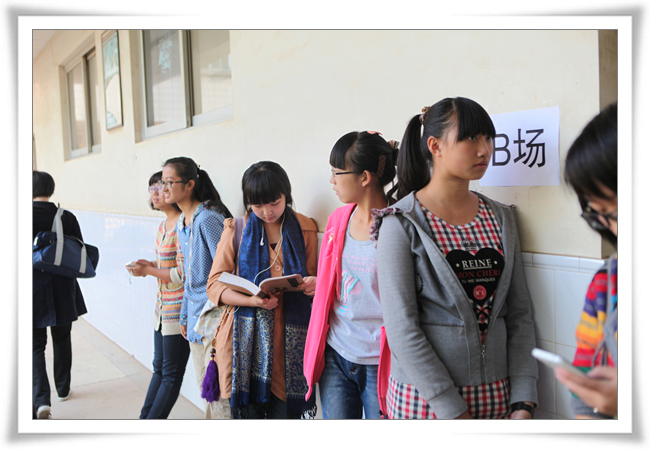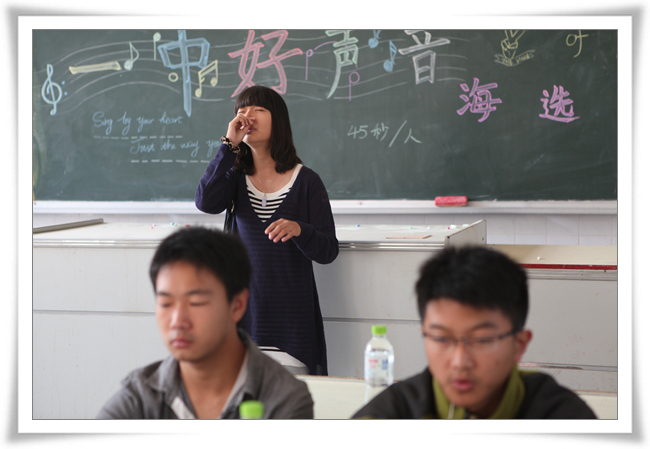 (记者:刘亦吟 摄影:王倡剑)经过一早上的激烈角逐,一中好声音结束了海选,产生了进入复赛的选手。早上八点半,科技楼小花园就挤满了选手,他们都在紧张地准备着,都想在短短四十五秒的展示时间里用最美的歌声打动评委的心。参赛选手的歌声,或小清新,或低沉浑厚,有的选手还带来了吉他,在展示歌喉的同时也秀出了自己的才艺。评委背对选手,公平地为他们的表现打分。在一中这样一所百年老校,也许处处皆有读书声,一中好声音为一中插上了歌声的翅膀,形成了读书声与歌声共鸣、学习与娱乐同在的轻松氛围。