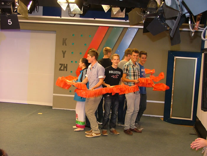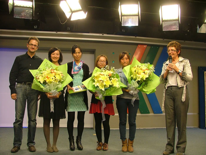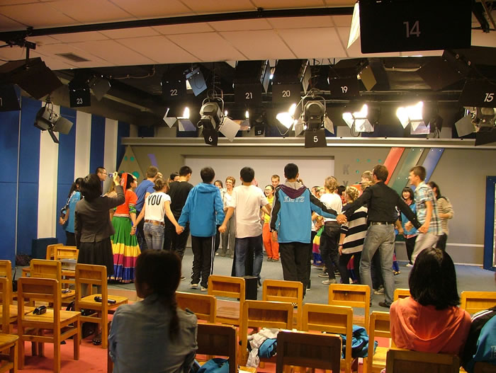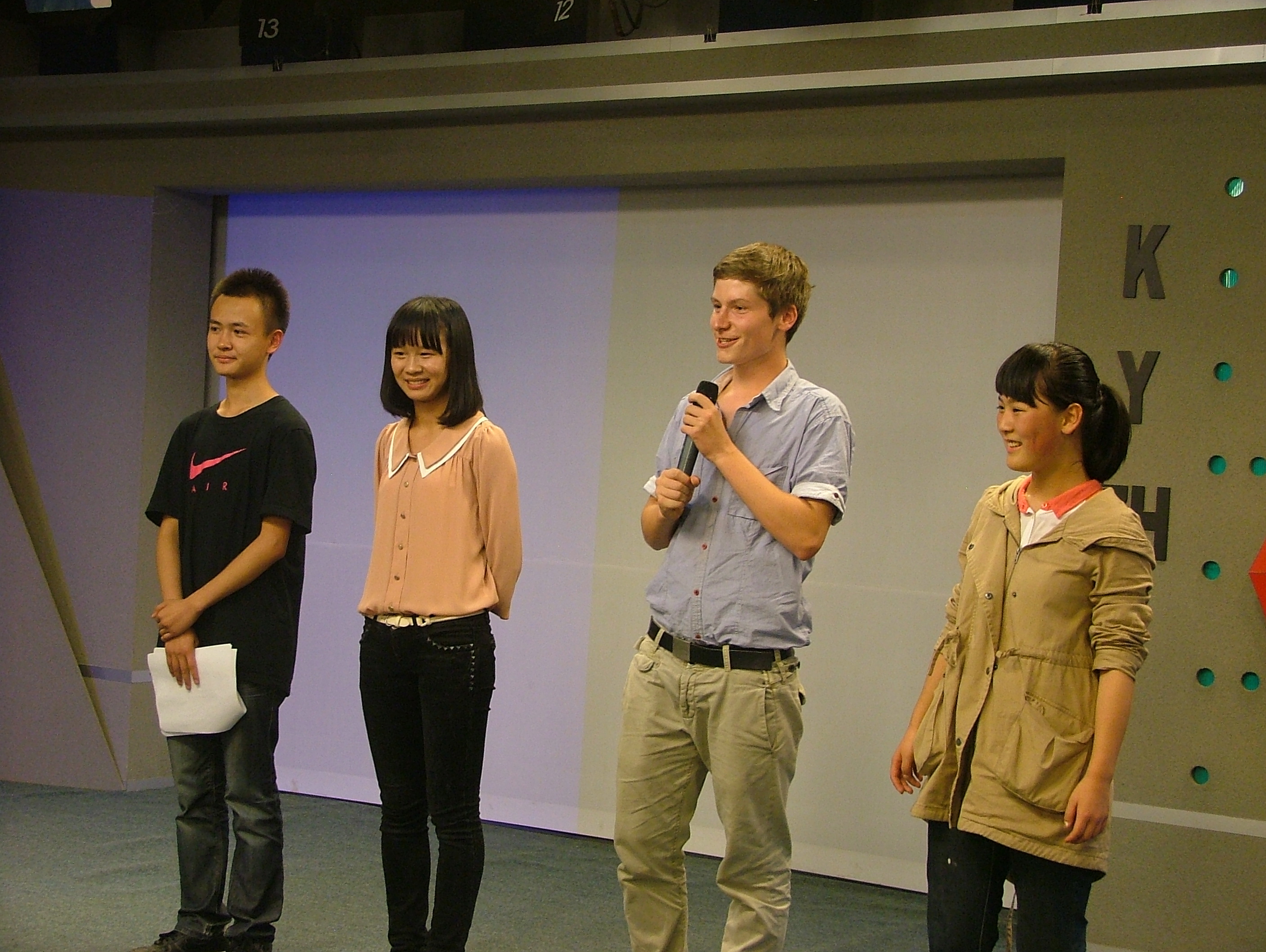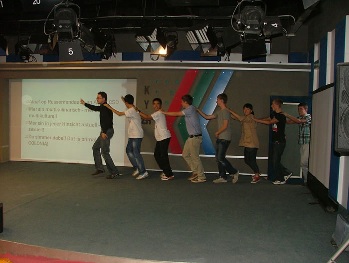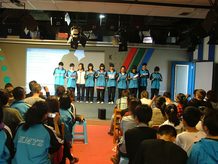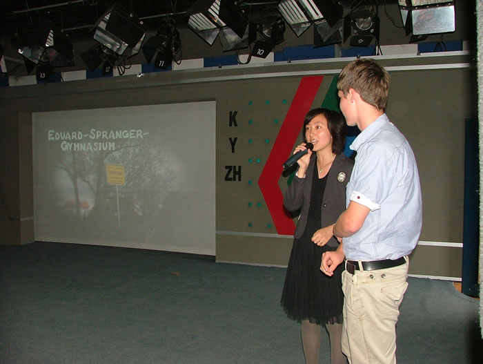 2012年9月20日下午5:30,即将结束对我校友好交流访问的德国ESG学校师生一行17人,在昆一中演播厅与德语班师生进行了联欢。联欢会气氛活泼、热烈。我校同学相继表演了民族舞蹈《剪纸姑娘》、《孔雀飞来》,以及动感、火爆的街舞秀,德语班同学还演唱了两首德语歌曲。联欢会互动频频,德国ESG学校师生展示了他们在访问期间学会的扇子舞。ESG学校带队教师还用新学会的葫芦丝演奏了一首德国歌曲。联欢会在中德师生一起欢跳舞蹈《火把节》中结束。
