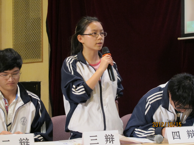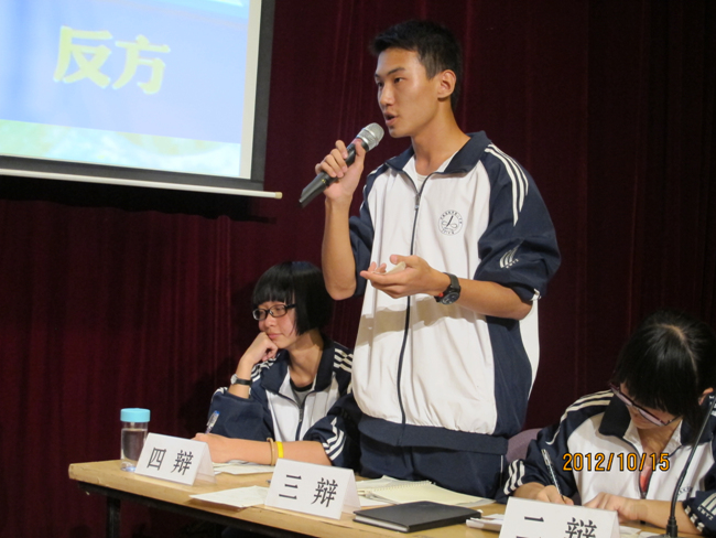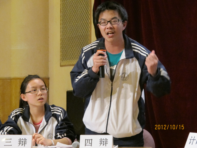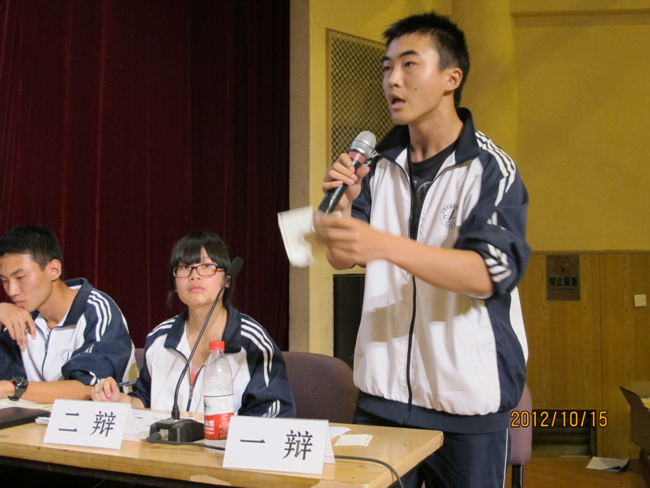 2012年10月15日晚7点,高2014届辩论赛决赛在报告厅揭开战幕。自9月4日初赛以来,前后历时一个月,17个班级经过初赛、复赛、半决赛的激烈角逐,最终文科(1)班和理科(3)班会师决赛。围绕“知足常乐”和“不知足常乐”,双方辩手你来我往,展开攻讦辩难,最终文科(1)班略胜一筹,摘取本场辩论赛桂冠,理科(3)班李智同学发挥稳健,荣膺本场比赛最佳辩手。真理越辩越明,本场辩论赛虽然“交锋”和“厮杀”不足,时有“混战”发生,但双方辩手无疑为现场同学如何审视和看待“知足常乐”和“不知足常乐”提供了新的视角,引发了我们思考,知足与不知足当前,积极调整自己的心态,进止有度,保持人生的常乐。