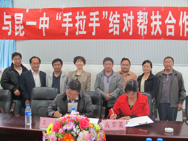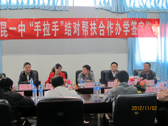 2012年11月2日,昆一中和石林县民族中学“手拉手”结对帮扶办学签字仪式在石林民中举行。石林民中是一所有着75年历史的老校,整体置换新建后的民中,气势雄伟,教学设施一流,正申报云南省一级完全中学。石林县教育局赵祖航副局长亲临现场并作讲话,希望石林民中依托百年名校昆一中加快步伐,迅速提升办学水平,想省一级完中迈进。昆一中高富英副校长、学生工作处杨杰文主任、学生工作处陈永裕副主任参加了签字仪式,高副校长就两校的合作前景发表讲话。