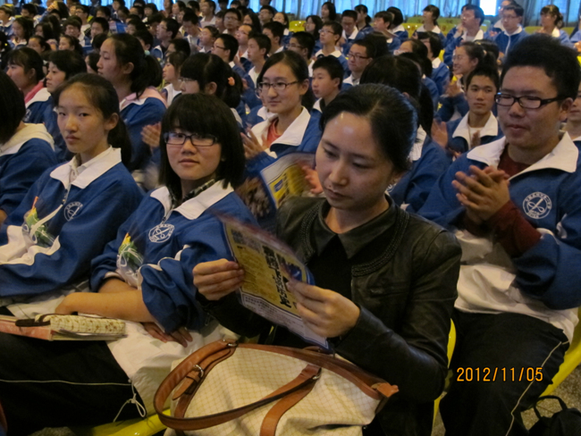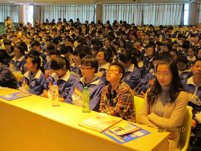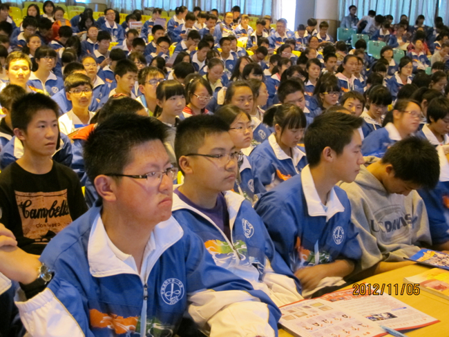 2012年11月5日17:00,学校多功能办公厅内座无虚席,来自2015届的700余名同学,聆听著名家庭教育专家李谓老师的专题讲座。李谓老师是享受国务院津贴的教育专家、高考阅卷评分细则制定者、北京人民广播电台《教育面对面》栏目主讲人,他为同学们主讲《如何高效学习》。从目标的确立、学习方法的选择、排除干扰的方法等方面做了精彩的诠释,博得同学们阵阵热烈的掌声。