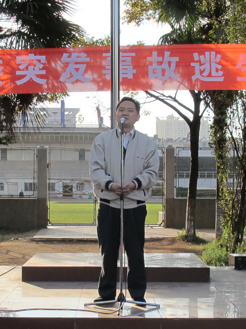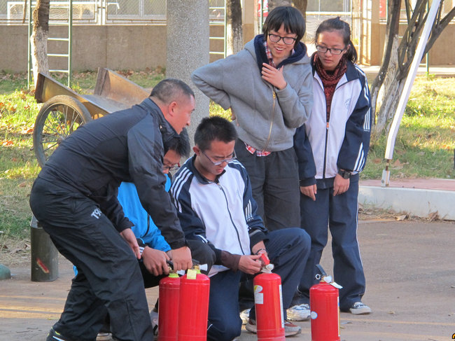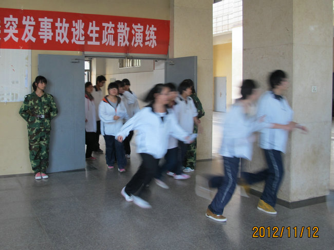 为确保学校的安全与稳定,有效处置地震、火灾等突发事件,能够统一指挥,有条不紊地进行紧急疏散教学楼内的师生,使安全事故损失降低到最低范围,学校于2012年11月12日17:10举行教学楼突发事故疏散演练。全校3000余名师生参与了疏散演练活动,顺利安全地完成了此次逃生演练。疏散到指定地点后,还进行了灭火演戏,让到场的每一位师生都会使用灭火器。演练达到了预期的效果。
