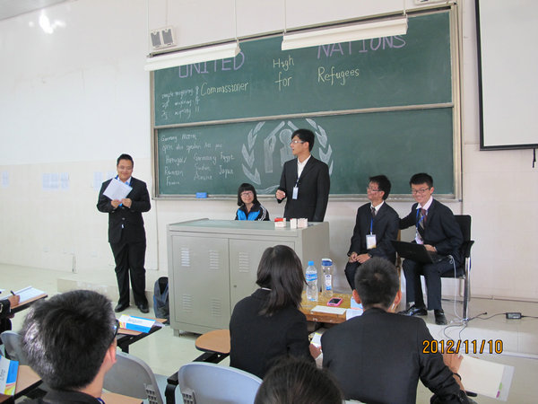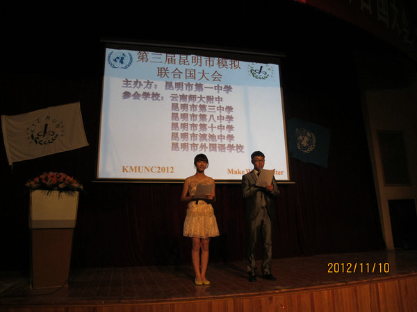 2012年11月10日至11日,第三届昆明市中学生模拟联合国大会在我校召开。分别来自昆一中、师大附中、昆三中、昆八中、昆十中、滇池中学、外国语学校七所学校的200多名同学集聚一堂,同学们个个身着黑色西服,手拿公文包,精神抖擞的参与本次盛会,在为期两天的大会中,各国代表围绕国际上的热点问题召开会议,共同商讨了关于“非洲优先”、“苏丹问题”、“苏丹人权问题”、“Refugee Problem in darfur . sudan”等四个问题,同学们分别扮演不同国家的外交官,作为各国代表积极的参与到“联合国会议”当中。各校代表们通过精彩的辩论、游说和演讲,竭力阐述“自己国家”的观点和维护“自己国家”的利益,整个大会获得了圆满的成功,并祝贺同学们在今后的“联合国”的舞台上,充分发挥自己的才能。