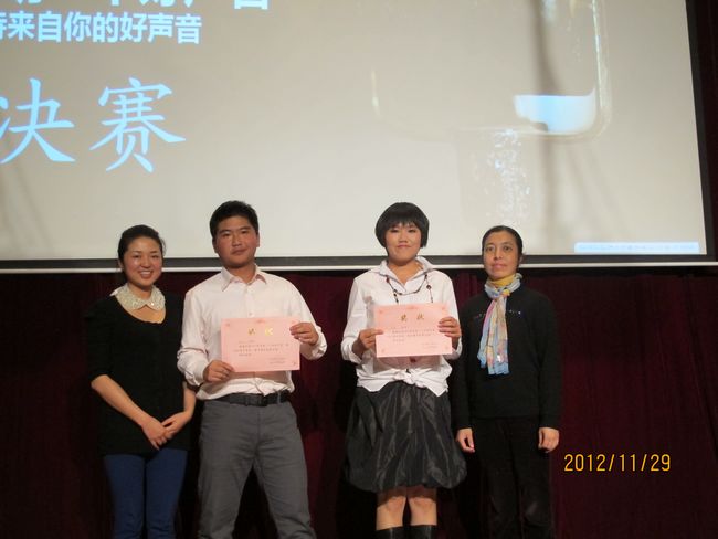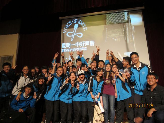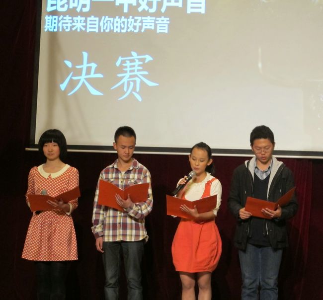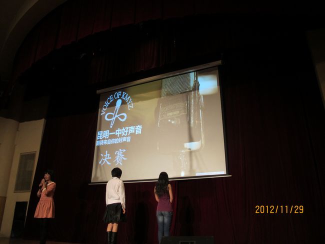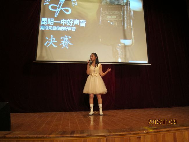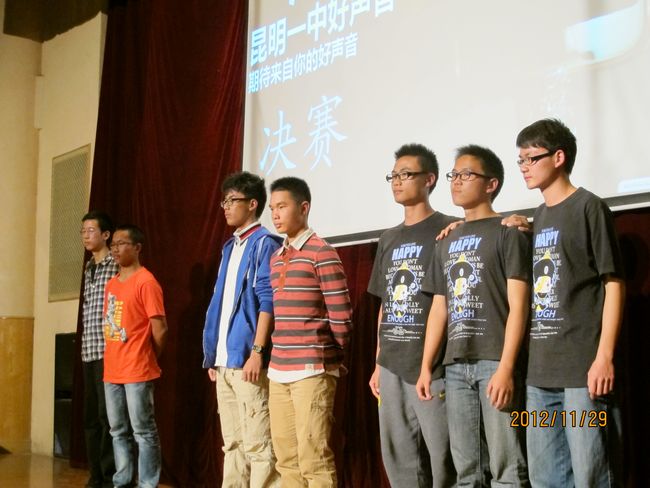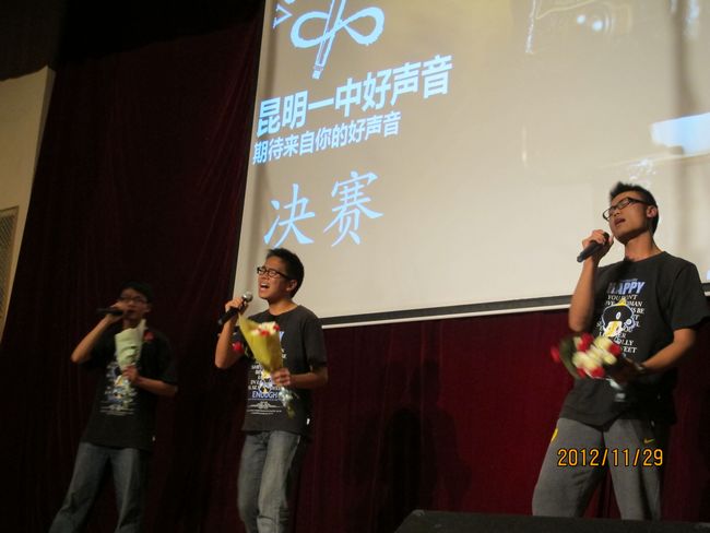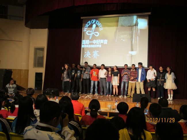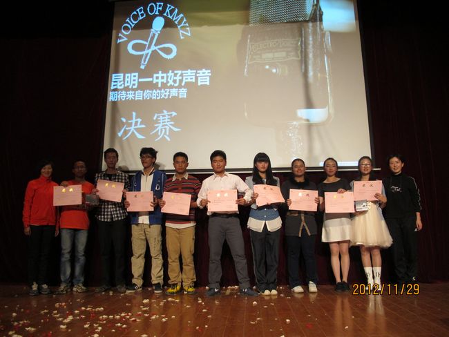 2012年11月29日晚19:30,昆一中报告厅挤满了近千学生,座无虚席。同学们翘首以待,那些隐伏在我们身边的好声音即将破空而出。经过海选和复赛,10余名实力唱将跻身决赛,分成的三支唱队分别由昆一中艺术组石老师、云南省艺术学院硕士卢老师和罗老师领衔。一曲歌罢,再致深情,梦回经典,流行前线,无一不撩人心肠,款款动人。经过大众评委、专家评委和导师现场投票,三轮激烈的比拼过后,最终高二理(9)班杨玄琳荣获冠军及最佳人气奖;高一(8)班罗婕、高二(8)班Heart beat组合、高一(12)班李彦筠荣获二等奖;高一(3)班李剑虹、高一(8)班吴卓芮、高一(18)班徐郡藜、NCC龙禹廷、高一(4)班潘姝蓉、高二文(2)班吴壤西、高一(16)班Beyond Inspiration组合、高一(18)班代数年华组合荣获三等奖;龙禹廷和罗婕还同时荣获了最佳舞台表现奖。一场好声音的饕餮盛宴,歌声已过,报告厅仿佛余音犹在。