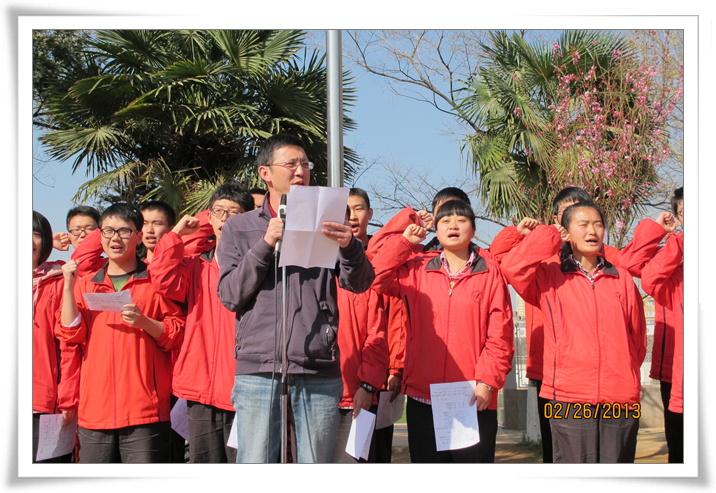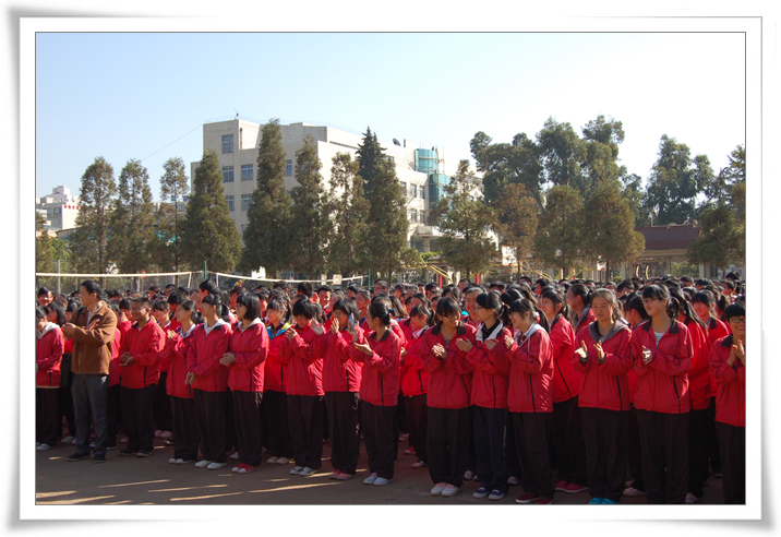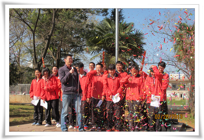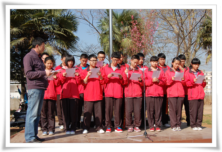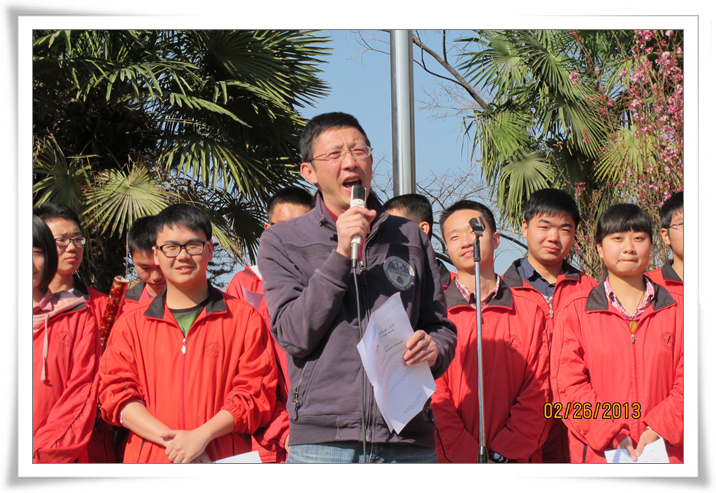 2013年2月27日上午课间操时间,高2013届举行了高考百日誓师大会。年级组长汤丹老师作了诙谐幽默、激情澎湃的动员讲话。他新编龟兔赛跑的故事,借以向同学们传达这样的理念:不要让别人的嘴巴偷走你的梦想,我们要做的事是——志存高远,坚持不懈。他还善意地提醒大家,冲刺的跑道上,路遇美景,我们要多一份自爱,自重,多一点理性长远的考虑;同时要自己创造好自己的心态,自己改变好自己的心态,我们是对手,而非敌人;希望同学们能以军人的意志,和尚的心态,乌龟的执著,兔子的速度问鼎高考。随后,陶睿、蒋嵘、董英杰等十二位同学代表高三学子宣言:十年磨砺,立志凌绝顶;百日竞渡,破浪展雄风;百日拼搏,拼效率,拼心态,拼意志,拼潜力,同自己的胆怯与懦弱,虚荣与懒惰斗争。我们有信念,有理想,有智慧,奋斗一百天,我们咬紧牙关;奋斗一百天,我们亮剑考场;奋斗一百天,我们铸就辉煌。最后,汤丹老师带领2013届学子庄严宣誓: