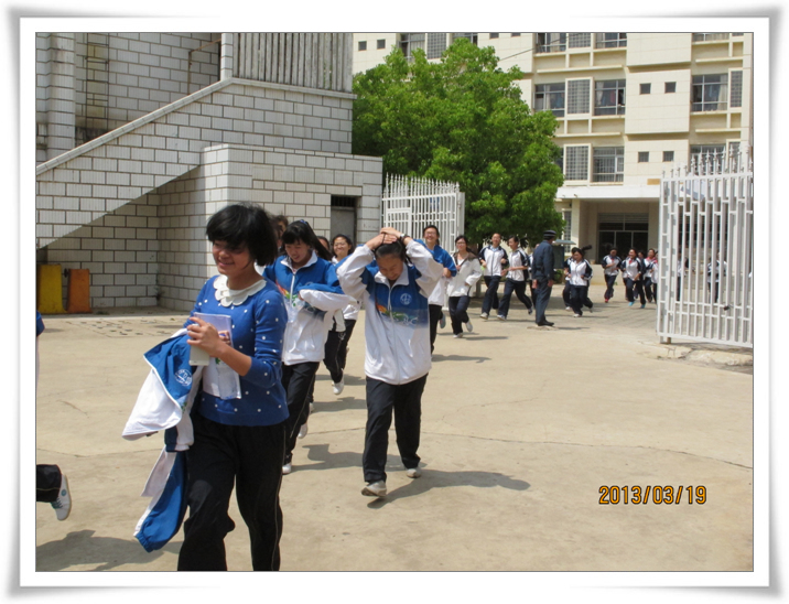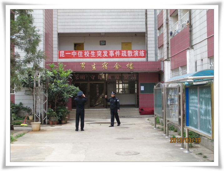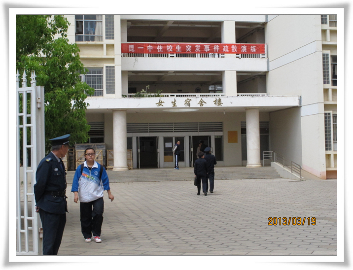 2013年3月19日13:10,学生宿舍的广播突然响起,传来急促的声音:各位同学,学生宿舍突发事故,请大家紧急撤离!这是昆一中举行住校生突发事故疏散演练。所有住校同学听到广播后,按预定方案的疏散路线有序而快速地撤到了空旷的球场。突发事故疏散演练是昆一中每学期的常态,要求每位住校同学熟悉自己的逃生路线,遇到事故按预定方案迅速撤离。疏散到球场后,辖区派出所民警还为住校生同学做了有关安全法制教育。学校党委副书记、副校长高富英老师参加了整个演练,学生工作处陈永裕主任组织疏散演练活动。整个疏散演练非常成功。