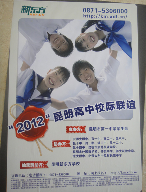 2012年3月25日,昆一中迎来了来自昆明市16所学校的老师和同学们,昆明市高中校际联谊活动在我校隆重举行。早晨八点,整个报告厅已坐无缺席。活动一开始依次由共青团昆一中委员会陈永裕书记致辞,昆一中学生会主席发言。各学校进行了精彩的节目展演,并举行了抗旱联名签名仪式和游园活动。本次校际联谊活动规模属历届最大,有17所昆明市高中参与活动,展演形式丰富,不仅加强了学校间联系,而且丰富了学生课余活动,还引导同学关注社会,拓展了视野。特别是结合云南连续三年的干旱,借校际联谊这个平台发出节水倡议,提出联名抗旱签名活动,被多家媒体报道,让社会听到来自我们中学生的声音。(团委牟洁老师供稿)
