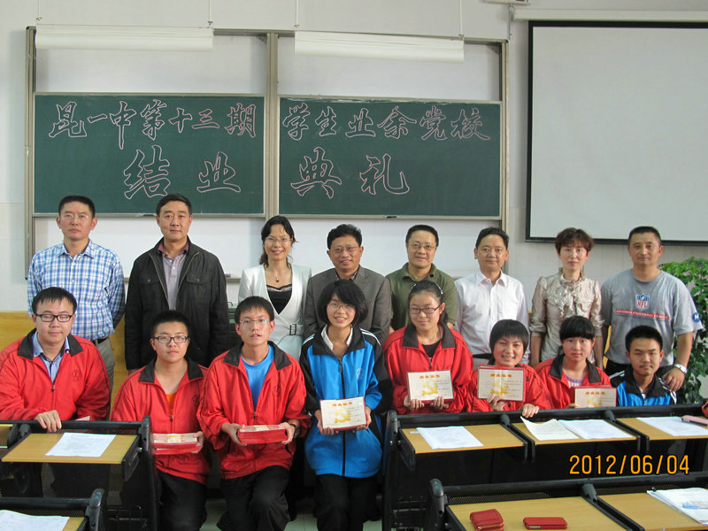 2012年6月4日下午5点,学校3号楼多媒体3教室座无虚席,国歌响起,学校正在进行第十三期业余党校结业典礼。出席结业典礼的有中共昆一中委员会书记王泉老师,党委委员、校长赵灿东老师,党委副书记高富英老师,党委委员、校长助理李品江老师,党委委员、党政办主任杜德祥老师,学生工作处主任孙碧桧老师;2012届党支部宣传委员、学生工作处副主任杨杰文老师,学生工作处副主任、团委书记陈永裕老师,团委干事牟洁老师。王泉书记和赵灿东校长先后发言,希望同学们信仰在心,不断前进。随后,同学代表依次上台发言,并观看了专题励志片《天堂的忏悔》。最后,本次结业典礼在庄严的国际歌中圆满完成。在座的146名同学通过为期两个多月的学习,认识了党的光辉历史,学习了党的优良传统与作风,树立了共产主义信仰等,以实际行动向党组织靠拢,完成了系列学习,获得了结业证书。