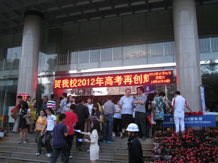 2012年7月1日昆明一中高中招生咨询会在科技楼举行。晚上7点半赵灿东校长宣布咨询会开始,赵校长就昆一中的办学理念、人才培养模式、今年的高考成绩、昆一中历史、办学条件等向参会人员作了报告,赵校长等多位学校领导认真回答了家长、学生的提问。咨询会在主会场科技楼报告厅和两个分会场多媒体教室1、2举行,人山人海,科技楼大厅占满了前来咨询的家长、考生,连楼梯和走道两边都坐满了人。一位来自云大附中中考估分845的考生,在父母的陪同下来到了咨询会现场,其父亲坦言:各个顶级重点高中都有新的办学理念,只不过昆一中的领导和老师更重视用行动来证明。他准备让孩子选择昆一中。