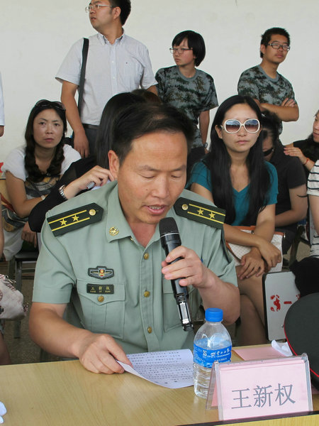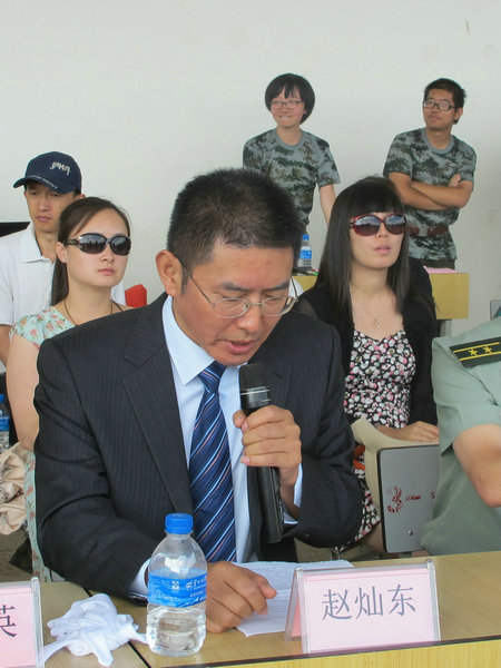 赵灿东校长、王新权政委在军训营长齐新国带领下检阅军训学生