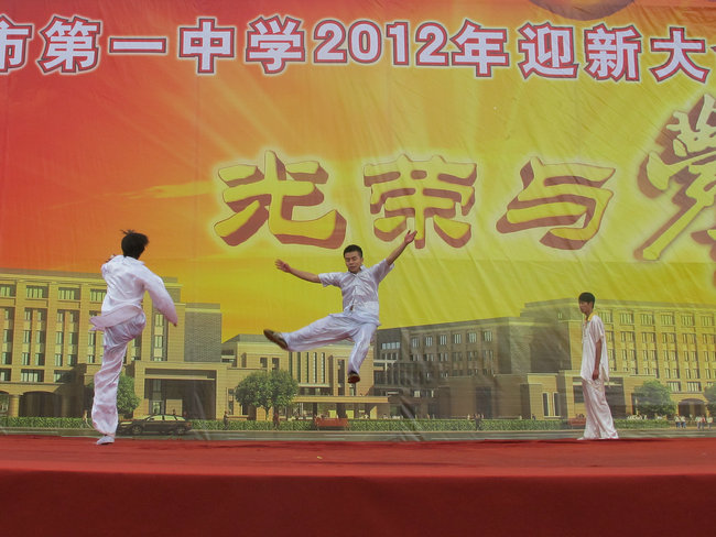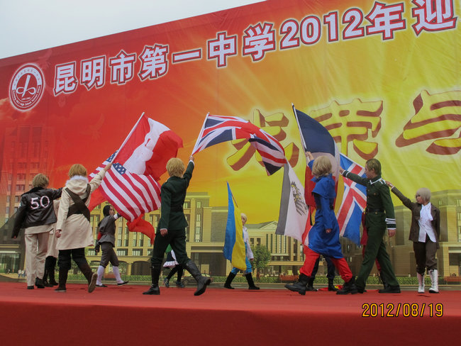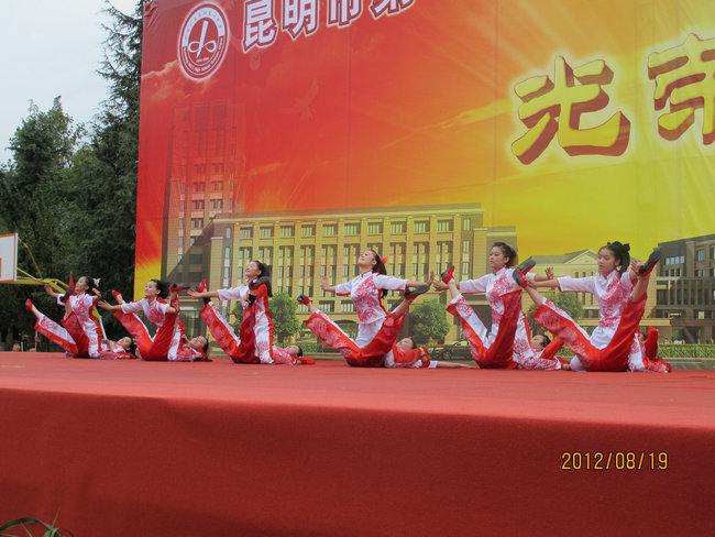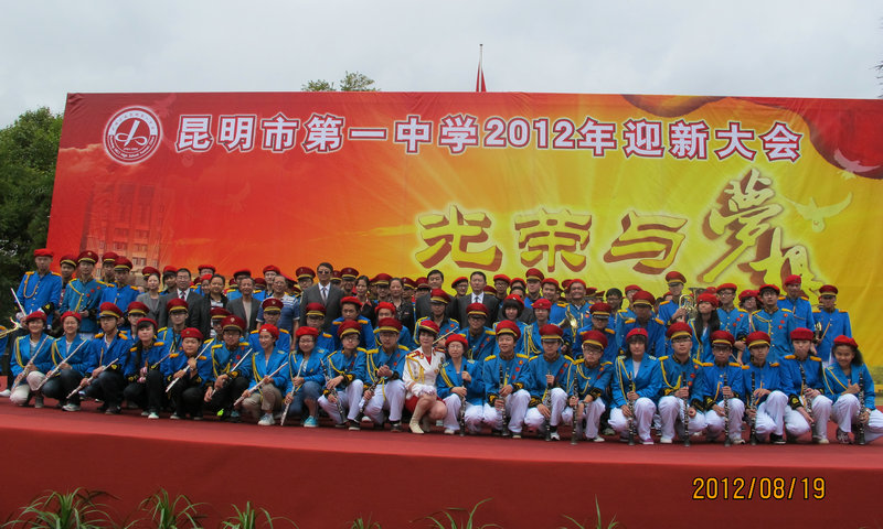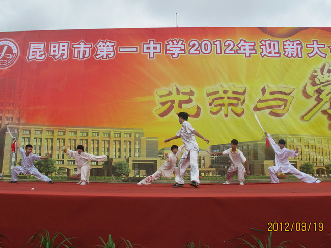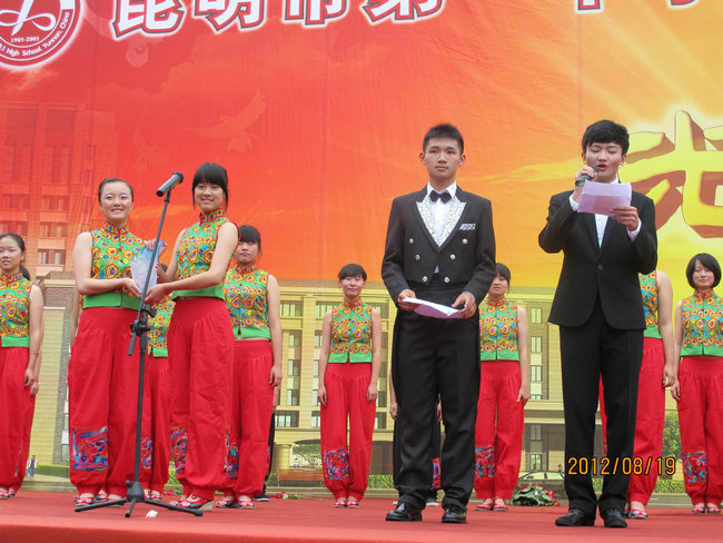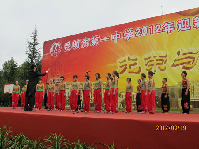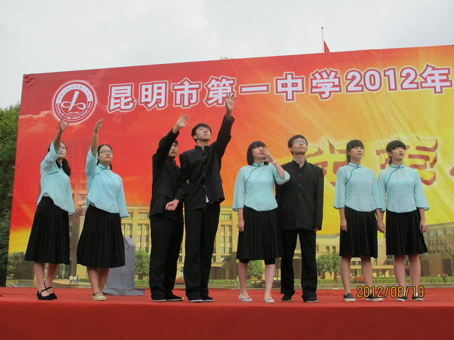 2012年8月19日,上午9:30,昆一中2012年迎新大会在学校隆重举行。学校中层以上领导、高2015届全体教师和学生以及家长齐聚学校篮球场,参加2015届迎新大会。虽然天公不作美,下起了秋雨,但台上演员和台下观众的热情丝毫不减。