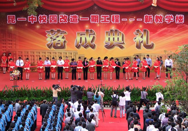 百年老校昆一中容颜焕发,彩旗飘扬,鼓乐齐鸣,昆一中校园改造一期工程——新教学楼落成典礼在昆一中新教学楼前隆重举行。