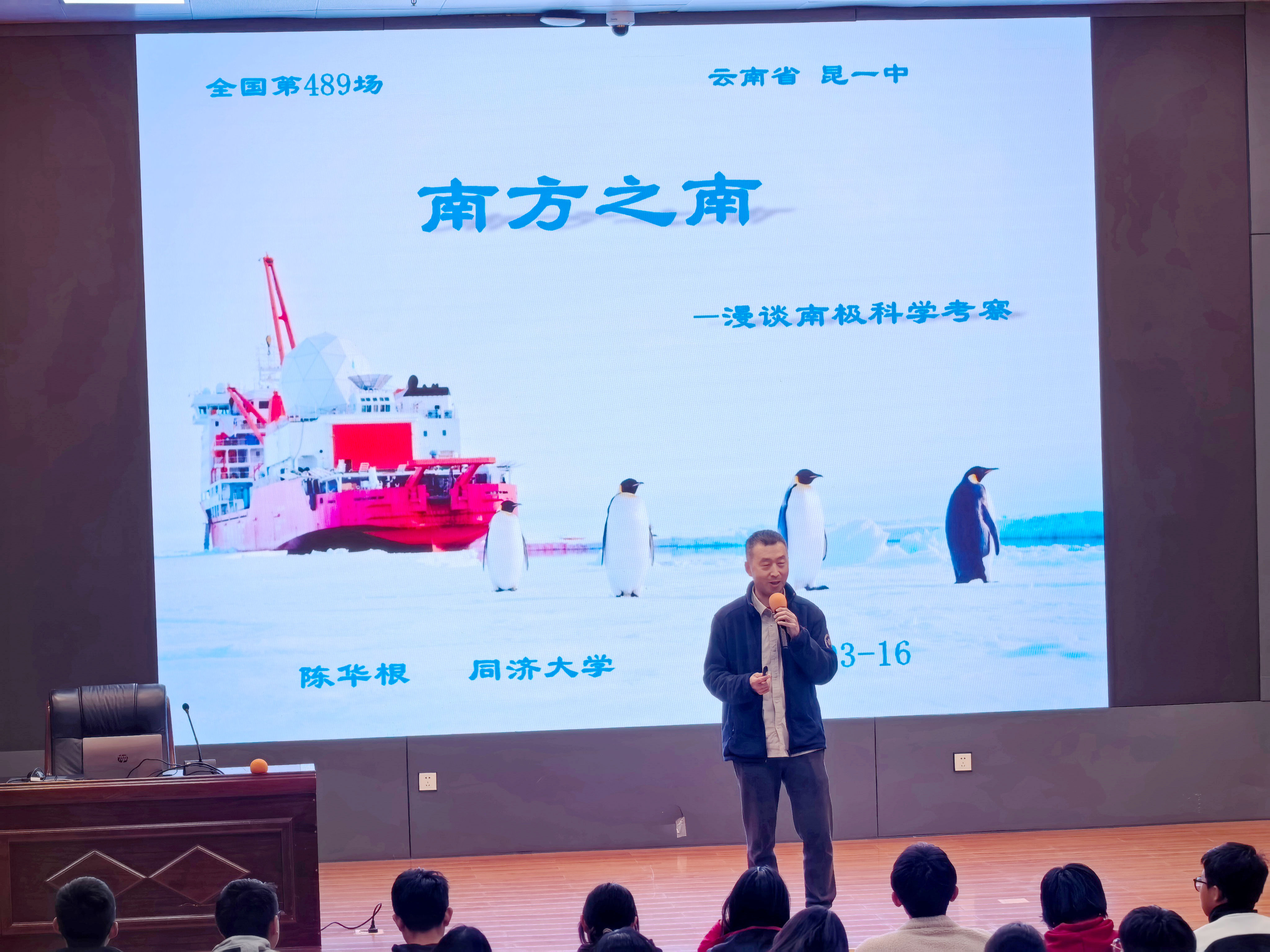为拓宽学生科学视野,厚植青年家国情怀,引领学子感受极地探索的时代魅力,2026年3月16日,昆明市第一中学特邀同济大学专家团队莅临校园,举办了一场精彩纷呈的南极科考专题讲座。高一年级学生及老师们齐聚会场,在同济大学地球物理和地球信息博士,博士生导师陈华根教授的生动讲述中,跨越山海奔赴南极大陆,聆听科考故事,感悟科学精神,汲取奋进力量。