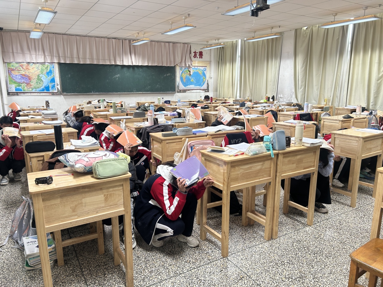 正在上课的老师立即停止授课,迅速指挥学生进行紧急避险。同学们反应敏捷,迅速抱头、蜷曲身体,躲在课桌下方。有的同学用书包护住头部,有的双手抱头紧贴课桌,整个教室秩序井然。