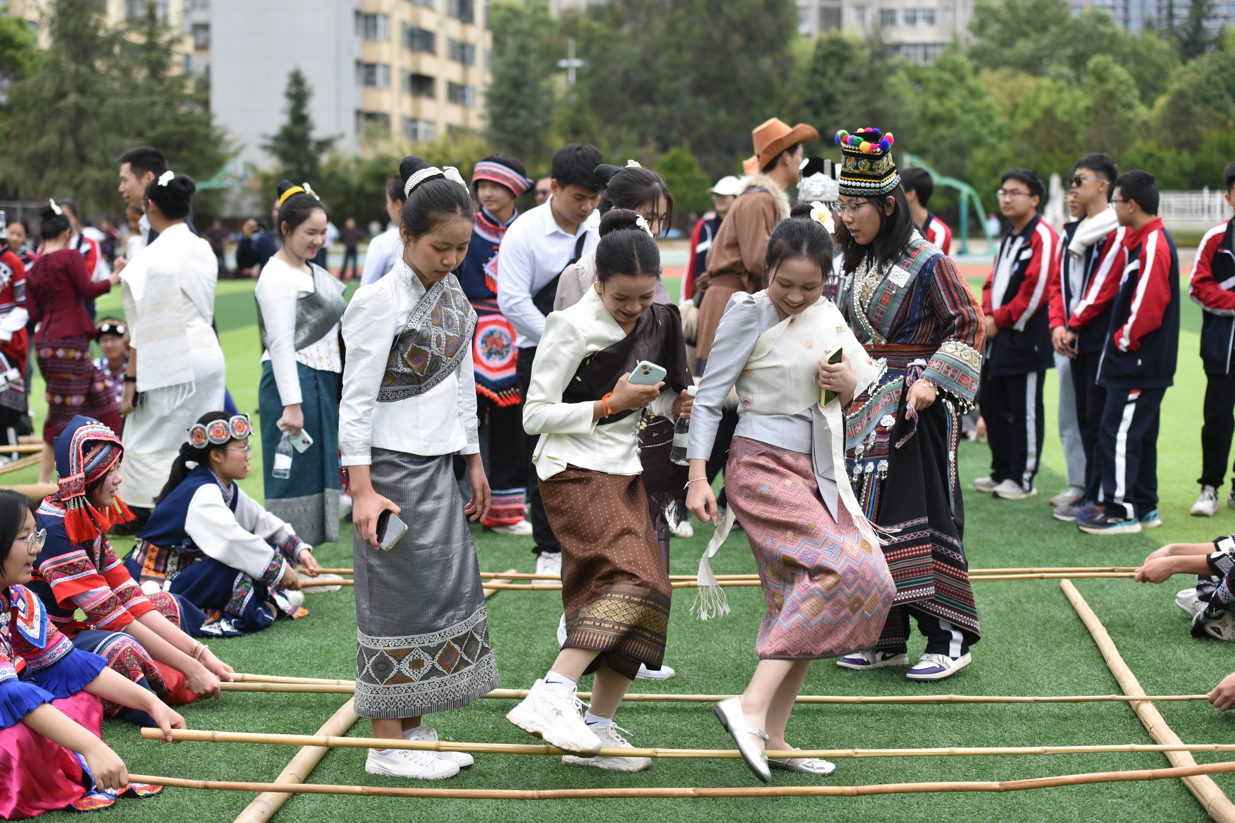 在学校足球场上,一场充满欢乐的团建交流活动如期开展,成为中老青年深化友谊的重要纽带。昆一中同学身着各民族传统服饰,以最饱满的热情迎接远道而来的老挝朋友,将云南多民族的淳朴好客展现得淋漓尽致。极具云南特色的竹竿舞率先点燃现场气氛,清脆的竹竿敲击声与悠扬的民族音乐交织,中老两国学生手拉手、心连心,相互配合、彼此学习,即便语言不通,灿烂的笑容也成为跨越国界的最好沟通,每一个舞步都传递着青春的喜悦与友谊的温情。随后开展的“鼓聚友谊、青春共鸣”同心鼓颠球活动中,双方学子齐心协力、默契配合,在一次次尝试、一次次协作中,打破隔阂、增进理解、建立信任,将“友谊第一”的理念融入每一个互动瞬间。