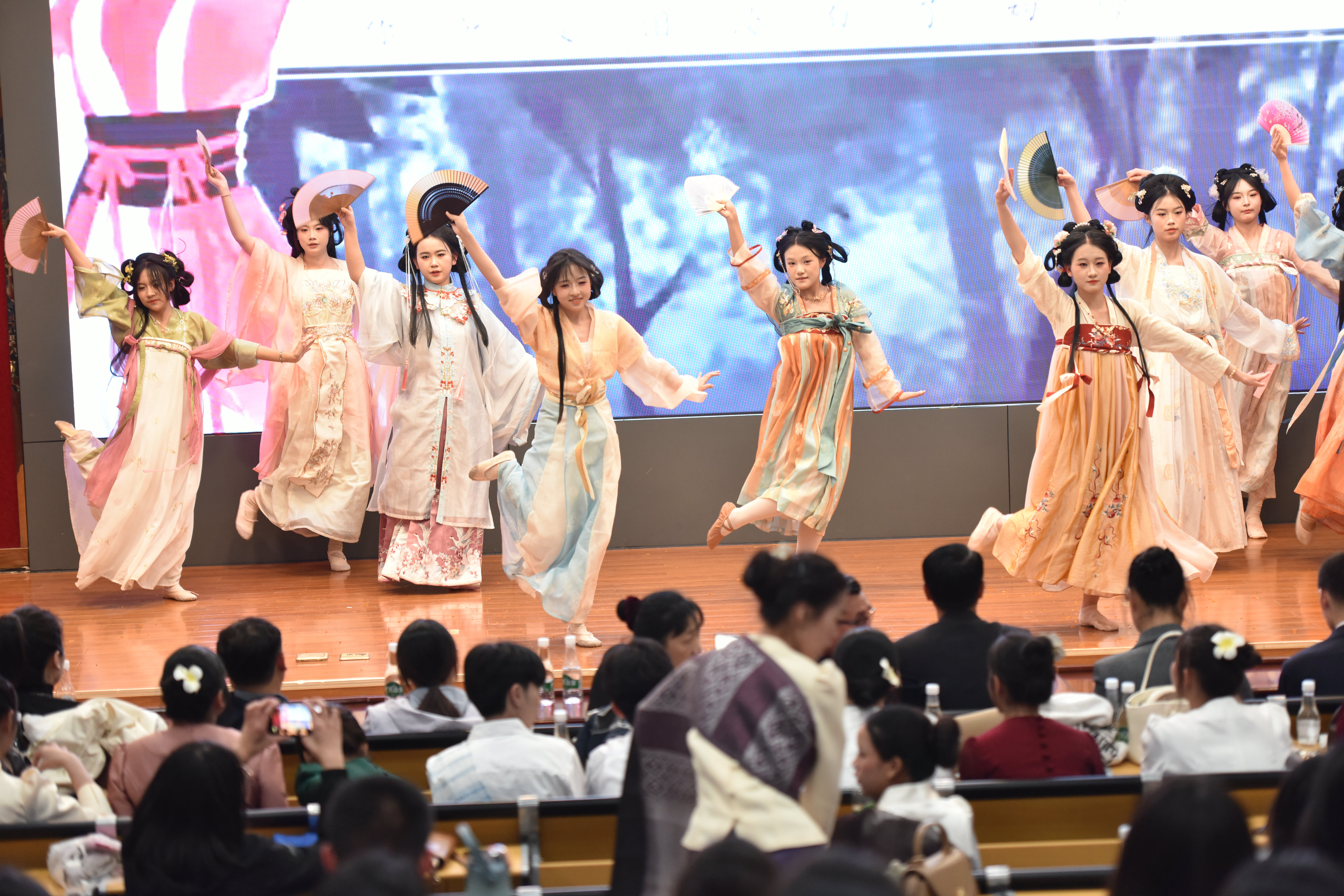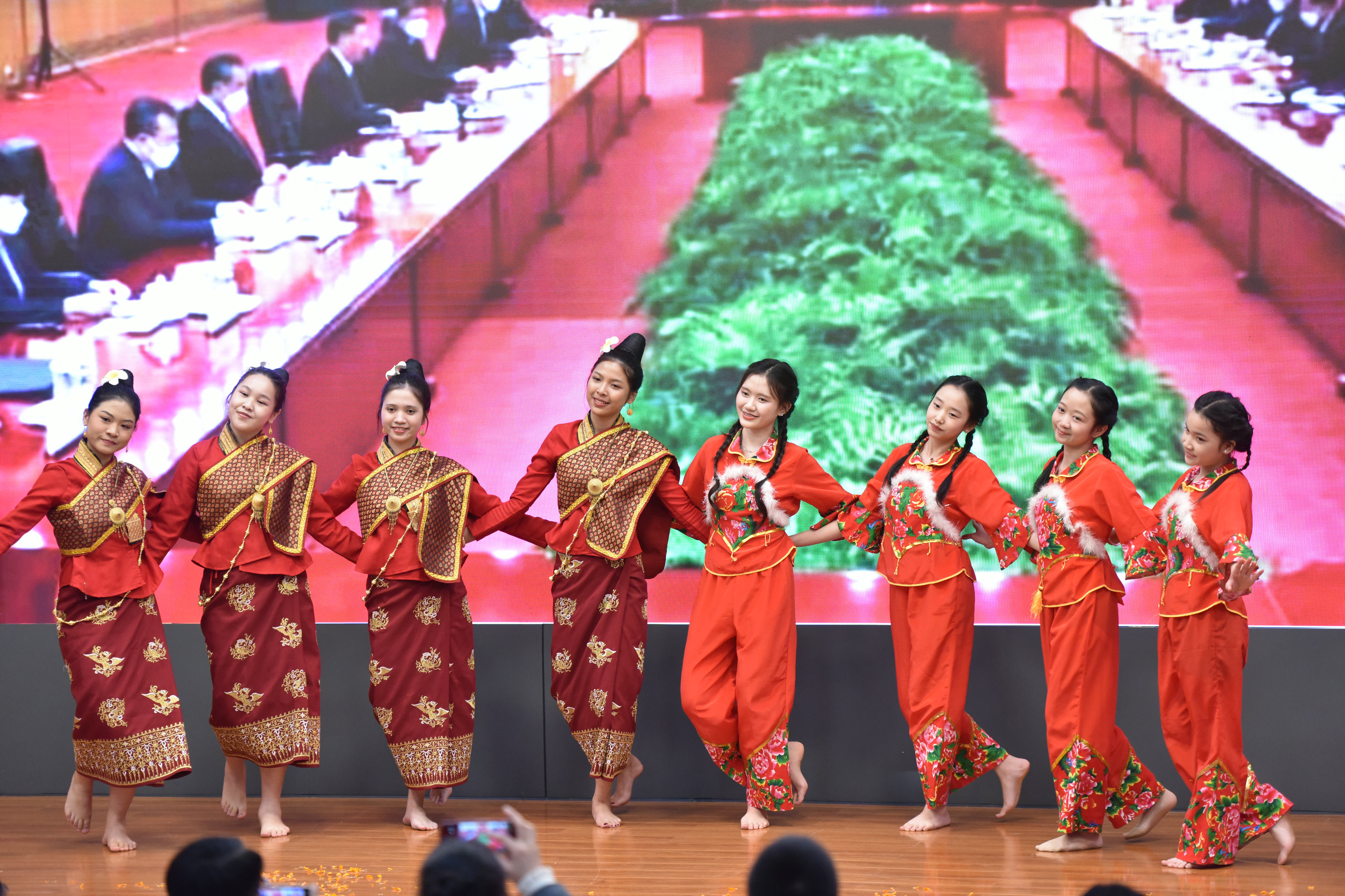 随后,昆一中、云南师范大学附属中学、老挝万象寮都公学、万象中学、琅勃拉邦和平中学五校学子,在学校综合楼报告厅共同呈现了一场精彩纷呈的文艺汇演,以艺术为桥,架起中老青年友谊的彩虹。汇演开篇,昆一中学子带来的中老铁路主题舞蹈震撼全场,舞者们以灵动的肢体语言,生动诠释了“一带一路”的时代脉动,展现了中老铁路作为“幸福路、发展路、友谊路”的深刻内涵,钢铁丝路与青春舞步交相辉映,为整场演出奠定了恢弘而温暖的基调。紧接着,老挝学子带来《欢迎来到老挝》《向快乐出发》等节目,以热情奔放的东南亚风情回应中方学子的盛情,其中中文歌曲的巧妙融合,更让两国青年的心贴得更近,友谊的暖流在现场悄然升温。云南师范大学附属中学学子带来的《Free Loop》与《我们的歌》串烧,以流行旋律搭建起跨越国界的青春共鸣,展现了当代青年学子开阔的国际视野。压轴登场的昆一中学子表演《兰亭序》,将中国传统文化的雅致气韵挥洒得淋漓尽致,水墨意境与少年风华相得益彰,为整场文艺汇演画上了诗意而圆满的句点。中老两国学子以艺会友、以心相交,用青春的热情与真诚,共同谱写了中老“胞波”情谊的新篇章。
