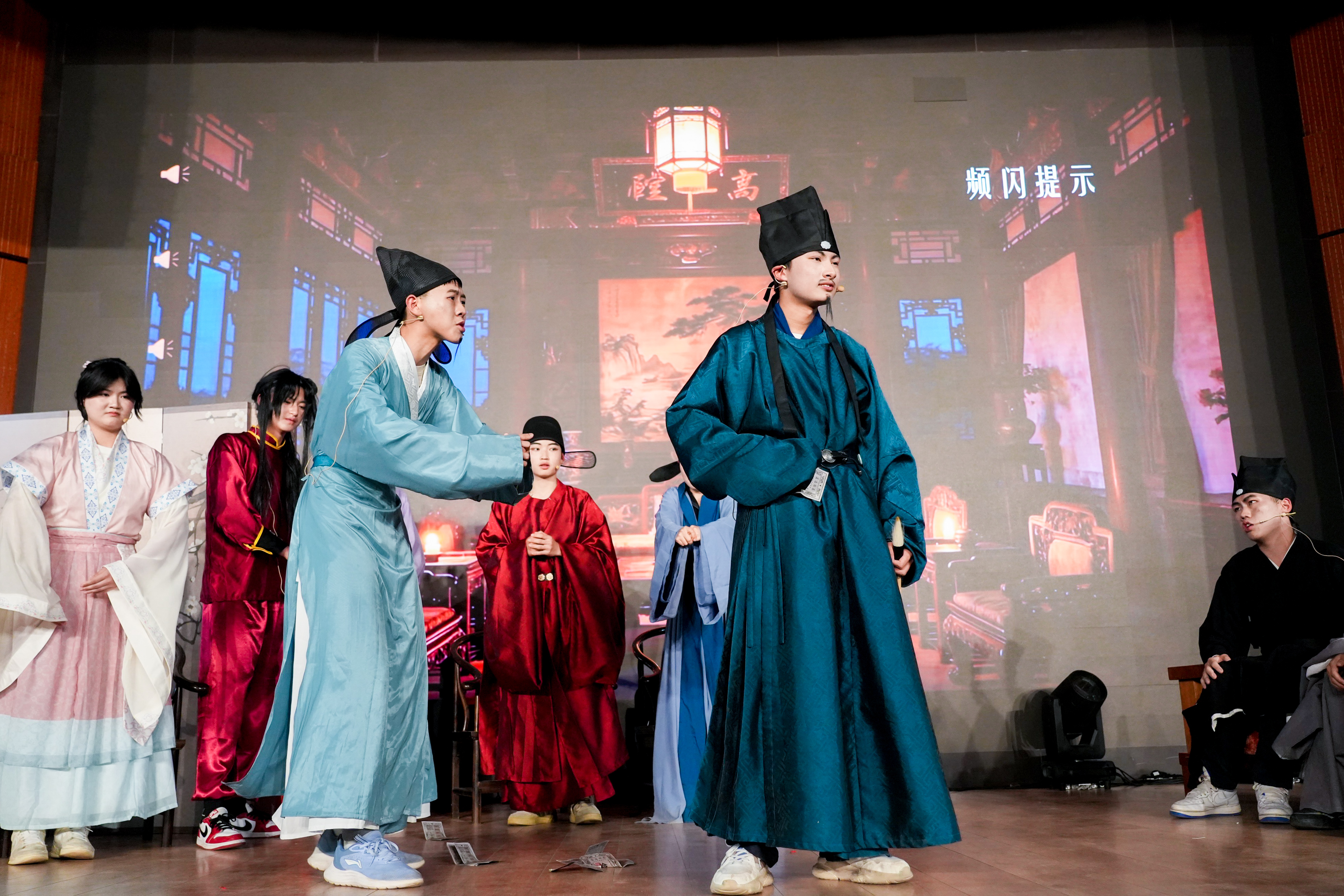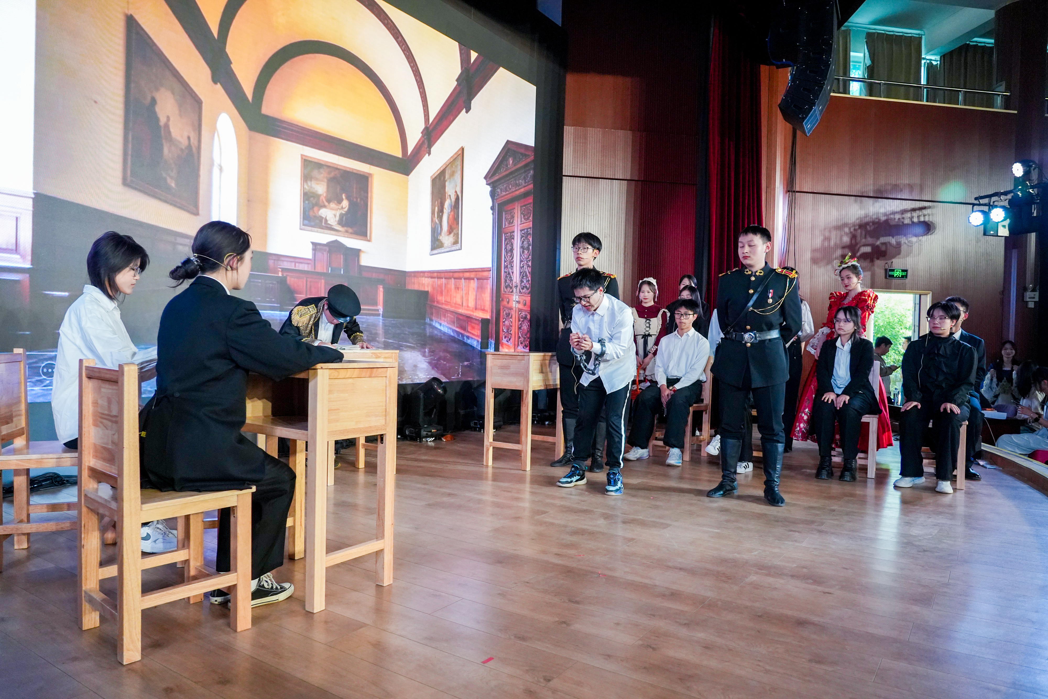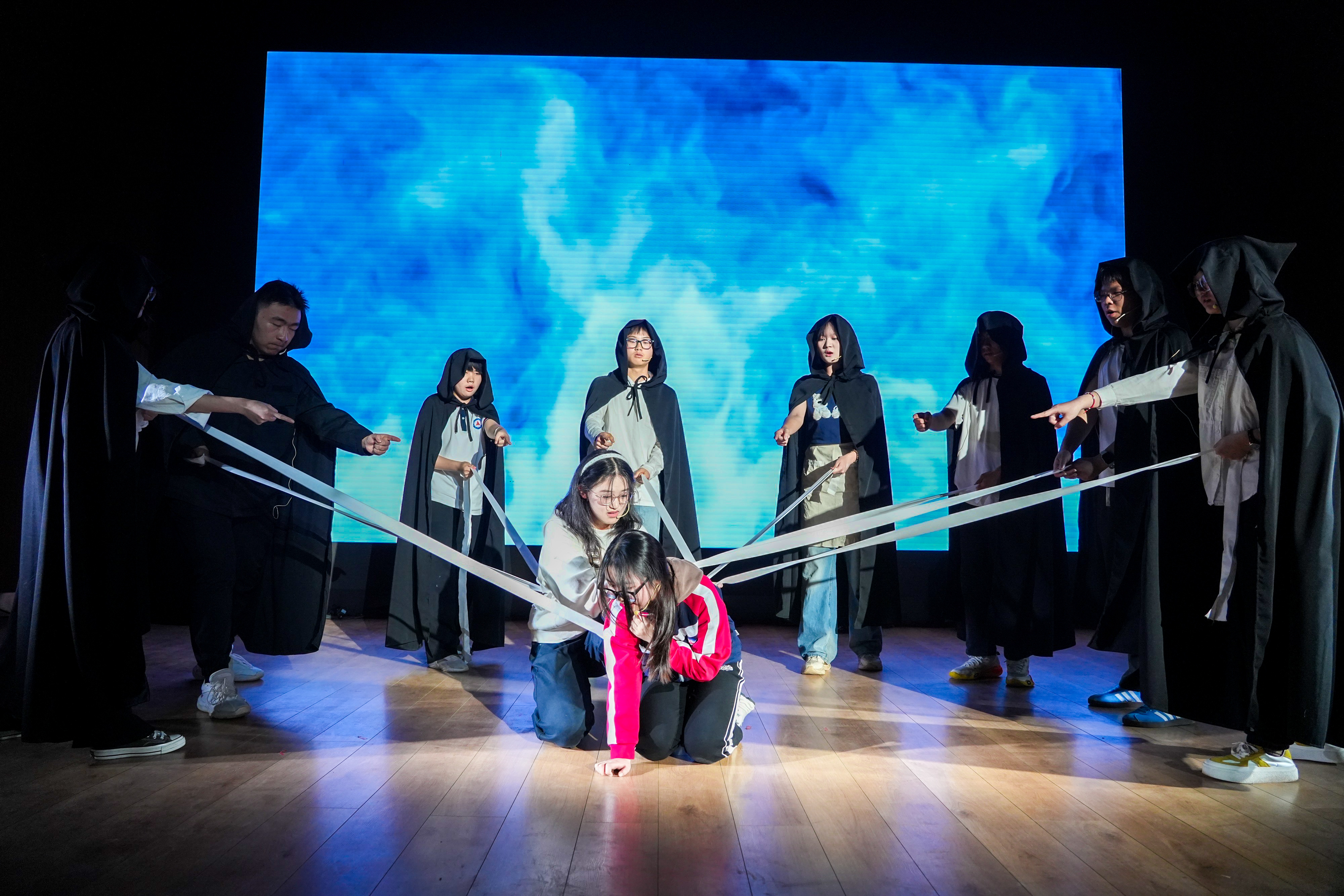 洞窥本质,已见真理。高二(14)班用一场荒诞的审判重现了尘封的历史,更将真理不畏权威的信念化作一场直击灵魂的戏剧独白。东南有佳木,向阳长新枝。高二(16)班的同学化作旧土里萌发的新生。舞台之上,每一寸伸展都在诉说:成长,是向着光的方向。作业成山的那晚,“爱丽丝”梦见自己跌进了兔子洞,高二(12)班的同学化成猫,鸟,列队前行的扑克。在红皇后的追捕下,“爱丽丝”找到对抗压力的勇气。国王克努特征战四方,啸向大海。却始终无法找到幸福的踪迹,直到高二(13)班的同学用北英格兰的雪花莲种下一片幸福的花田。笙歌彻夜,面具之下暗藏杀机;觥筹交错,笑语之间剑影刀光。高二(15)班的同学们将这场华美而阴郁的宫廷夜宴搬上舞台,演绎了一场关于欲望、权力与背叛的悲剧。沉默不是屈服,是无言的坚守;荣耀不在喧哗,在寂静中生根。高二(3)班的同学们讲述了一段关于信念与尊严的故事。当世界喧嚣,总有人在静默中扛起属于自己的荣光。一本练习册,穿越时空的鸿沟;一双手,递向知识荒原里的尤利娅。高二(5)班的同学们固执地点亮火种。穿越而来的练习册,不只是题目,是希望,是一个时代对另一个时代的馈赠。巴黎的夜幕下,街垒升起,热血洒落。高二(6)班的同学们用激昂的群戏,再现了那个理想与鲜血交织的夜晚。枪声、呐喊、倒下又站起的身影——自由的光芒,从未在黑暗中熄灭。