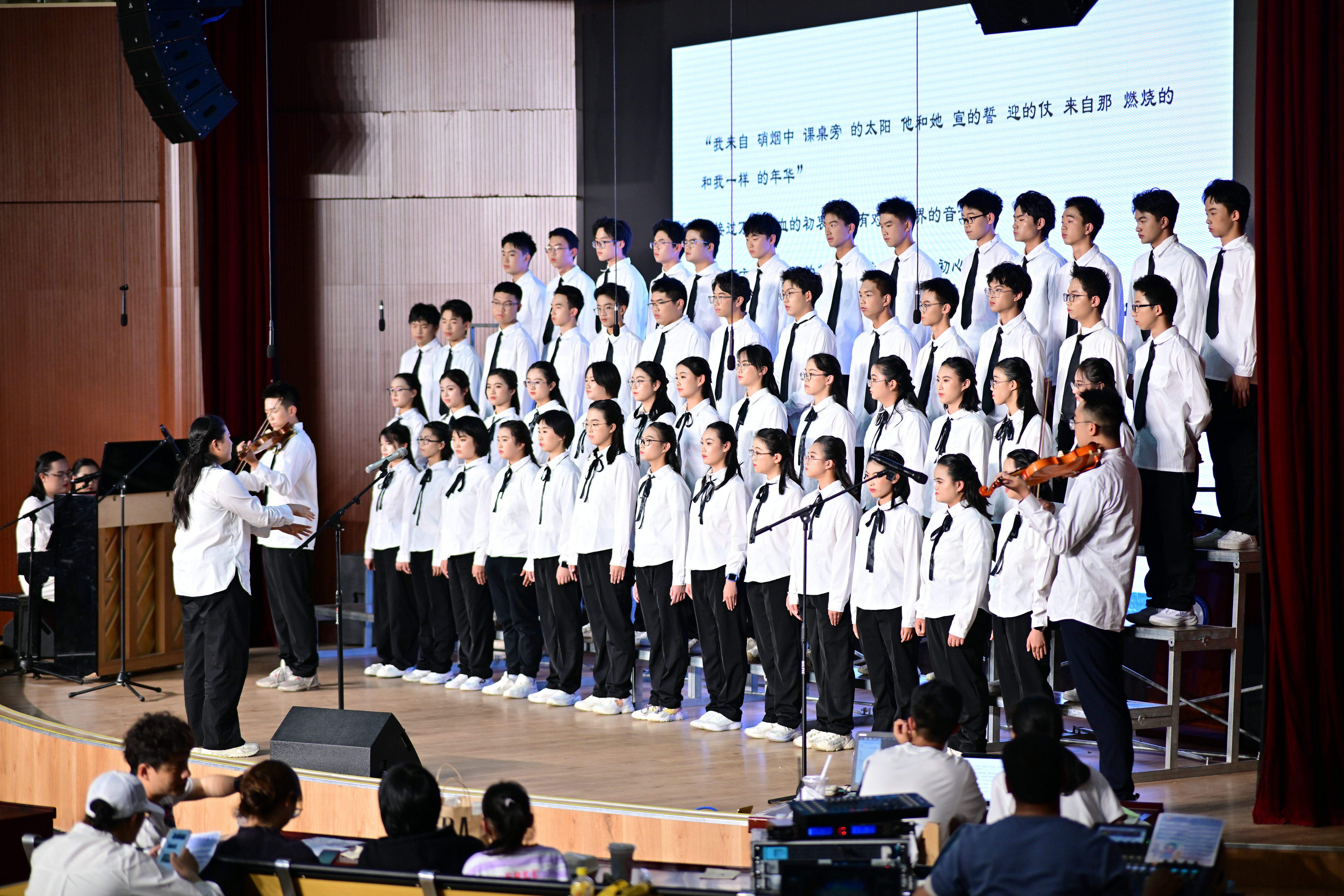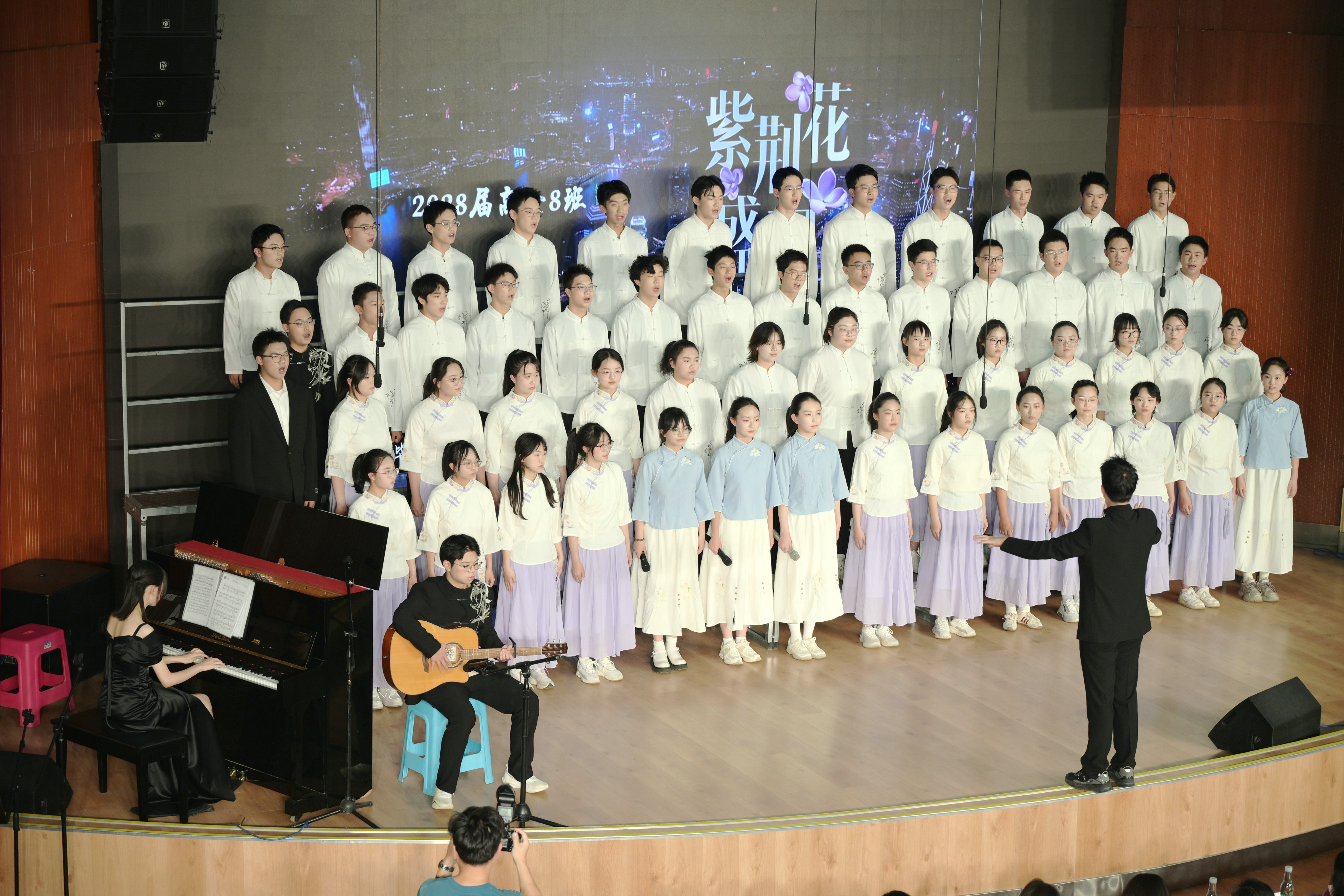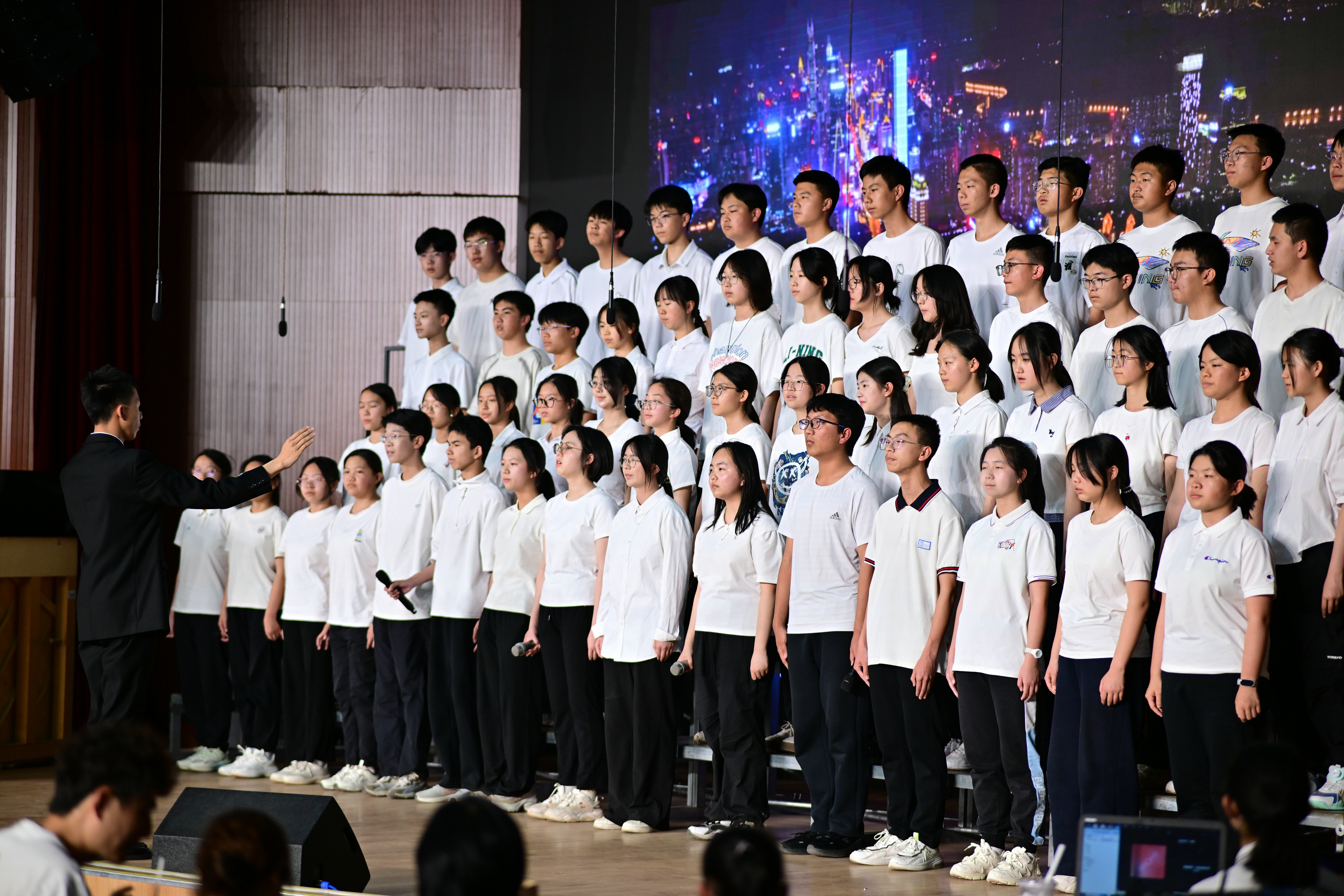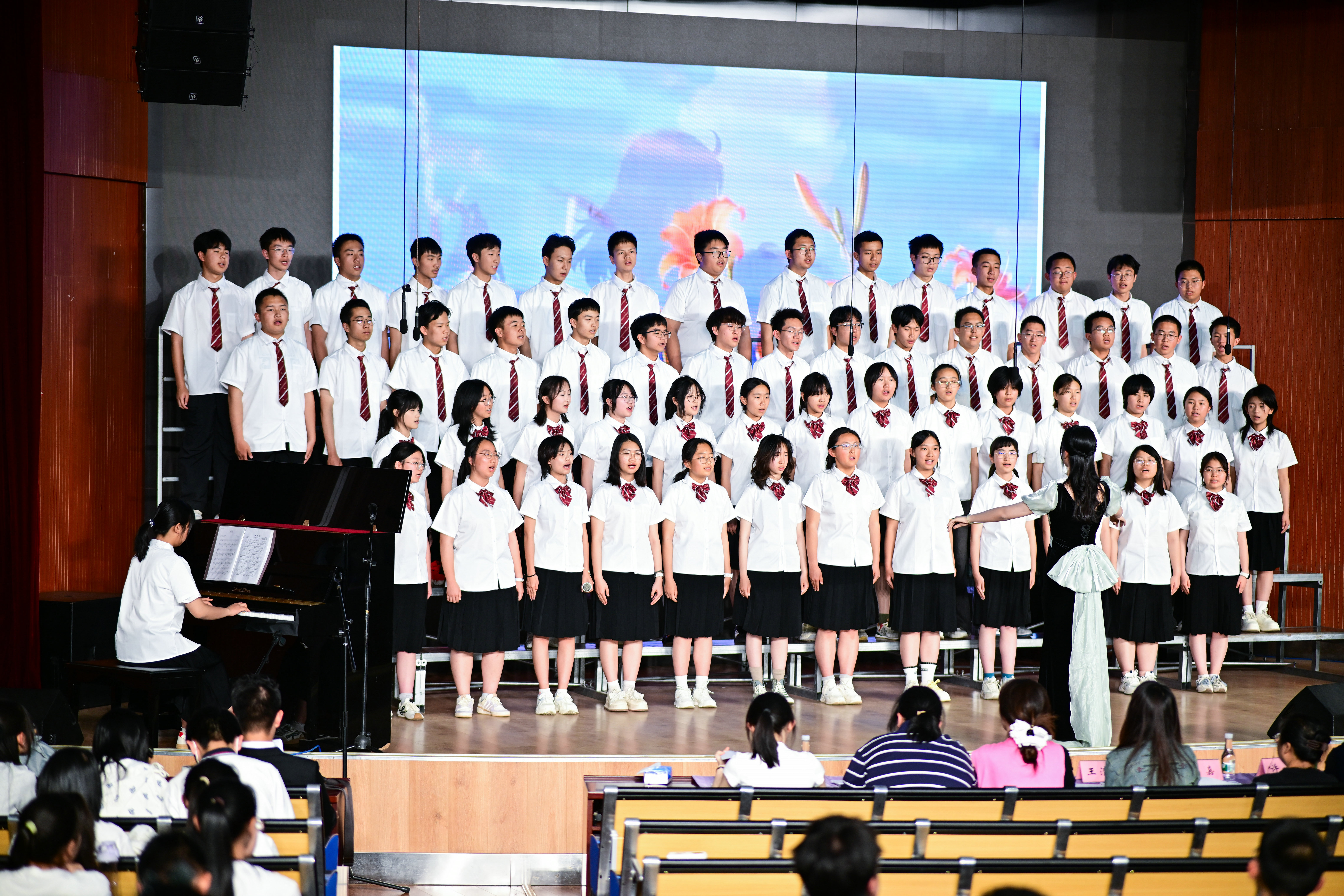 2班以《我是如此相信》为誓,以青春之名赴时代之约,怀揣热爱与勇气,坚定向前,始终追逐光、成为光;16班以《你从未离去》诠释同窗温情,前路相伴,情谊不散;8班以《紫荆花盛开》唱响紫荆盛放,情深意长,愿繁花永驻、山河无恙;14班《夜空中最亮的星》以歌声为灯,照亮前行之路;13班用《萱草花》传递温暖牵挂,刚柔并济间尽显少年的担当与柔情;11班以“有我”为志,以青春之名守护山河壮阔,奔赴未来征途;18班以《明天会更好》祈愿美好,借和平清泉的温润,传递对未来的无限期许,愿少年前程似锦,愿世间岁岁安康。