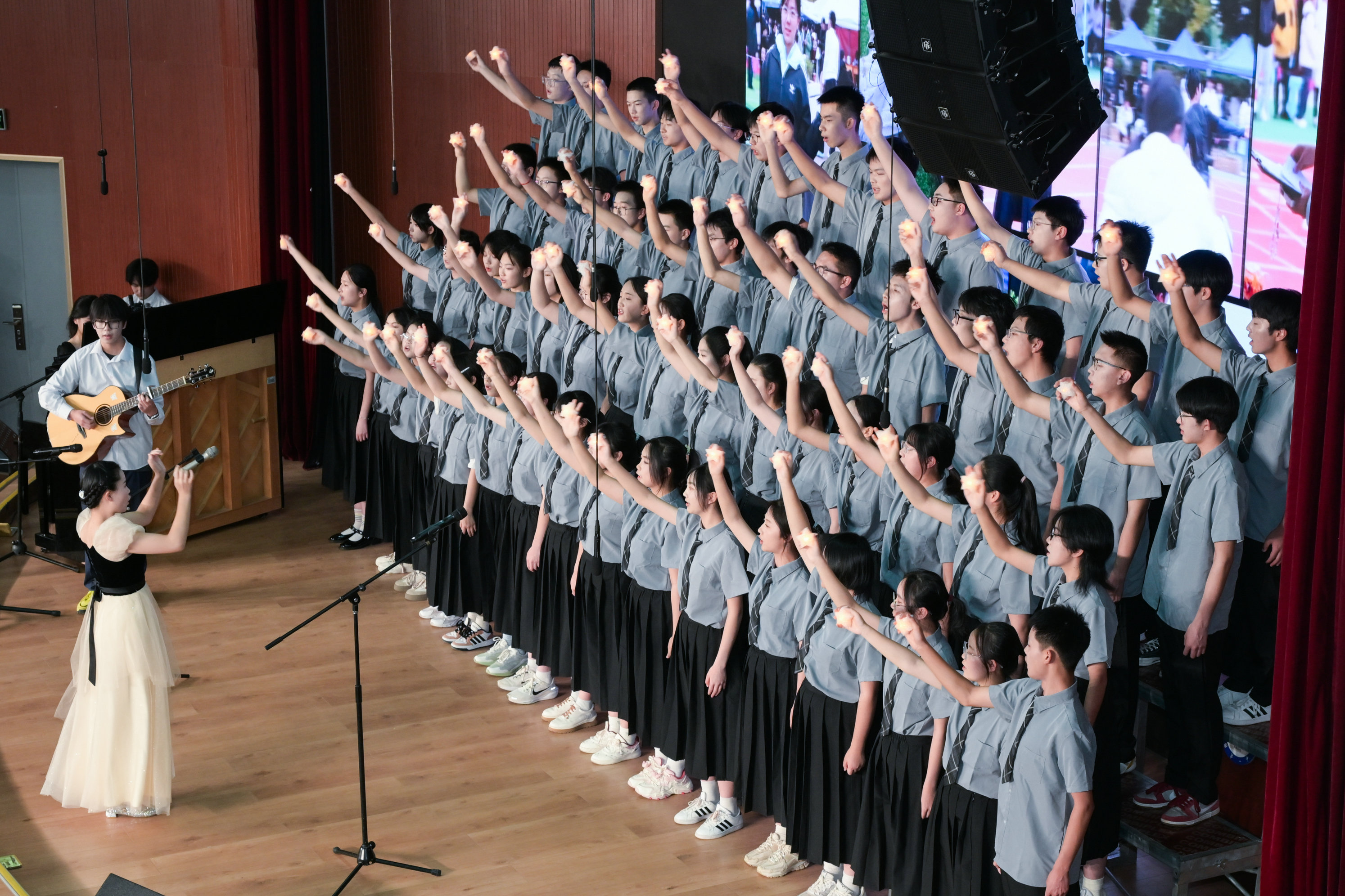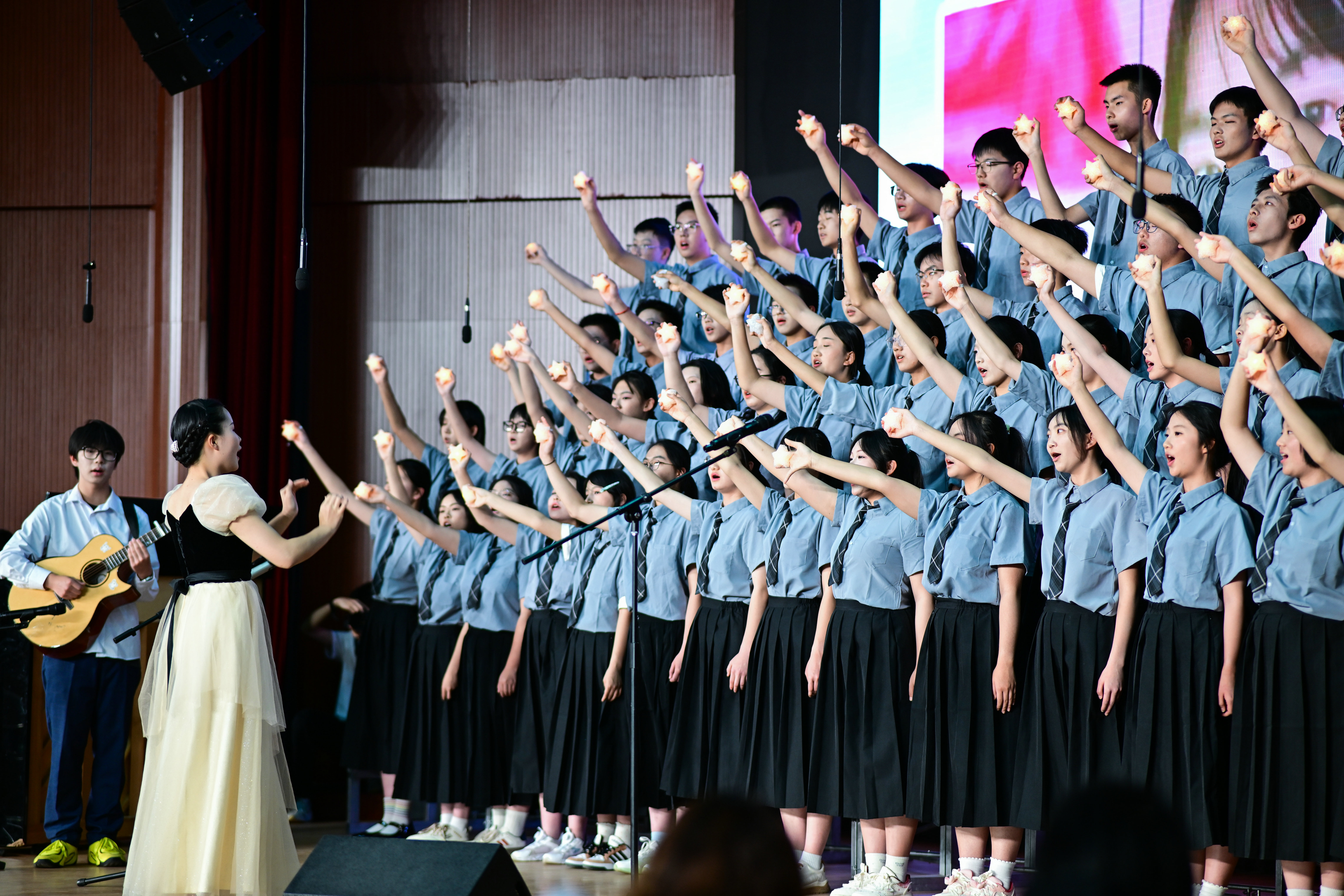 19班以满腔赤诚唱响《我爱你中国》,青春的声线里满是滚烫的热爱,诉说对这片土地最深沉的眷恋;12班以《我爱你中国》传递昆华学子的赤子之心;高一4班演绎《如愿》,愿岁月温柔,愿你我所愿皆有回响,在歌声中寄托对家国的祝福、对未来的期许;22班以《向光而行》宣告初心滚烫,向着澄澈高远的未来奋力翱翔,不负少年意气。