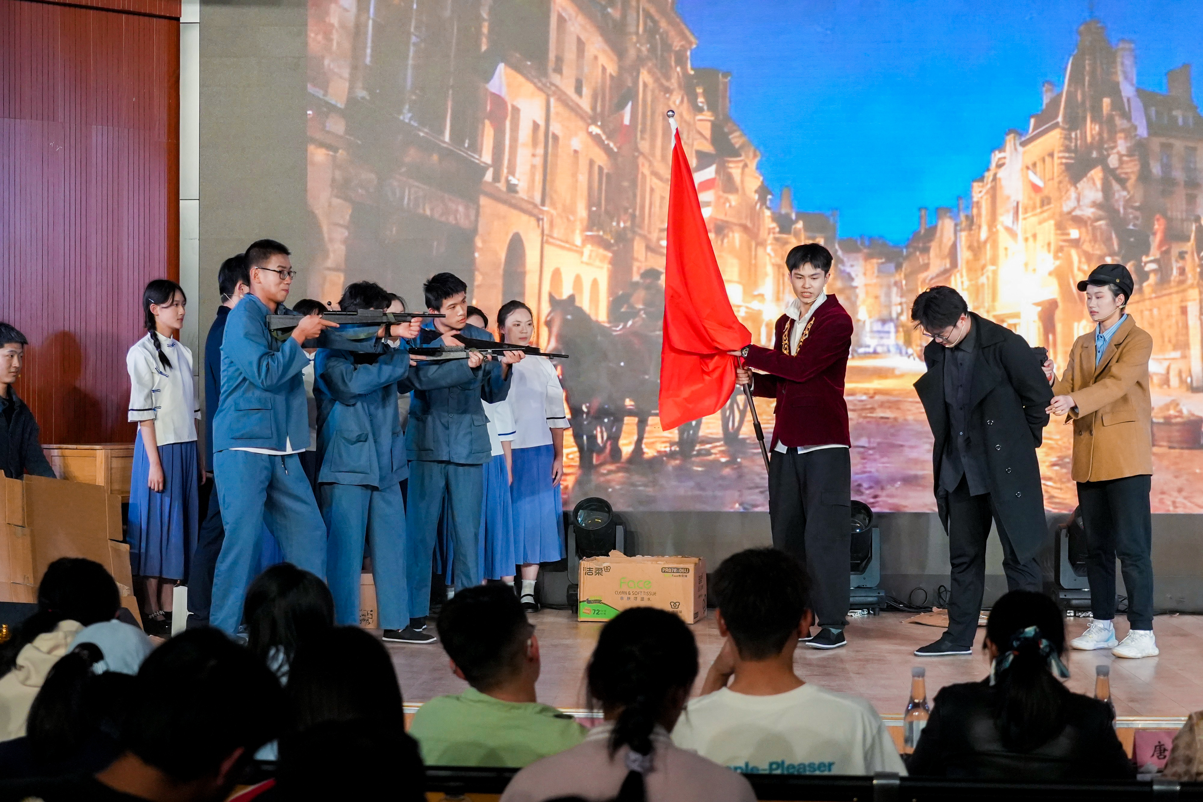 洞窥本质,已见真理。高二(14)班用一场荒诞的审判重现了尘封的历史,更将真理不畏权威的信念化作一场直击灵魂的戏剧独白。东南有佳木,向阳长新枝。高二(16)班的同学化作旧土里萌发的新生。舞台之上,每一寸伸展都在诉说:成长,是向着光的方向。作业成山的那晚,“爱丽丝”梦见自己跌进了兔子洞,高二(12)班的同学化成猫,鸟,列队前行的扑克。在红皇后的追捕下,“爱丽丝”找到对抗压力的勇气。国王克努特征战四方,啸向大海。却始终无法找到幸福的踪迹,直到高二(13)班的同学用北英格兰的雪花莲种下一片幸福的花田。笙歌彻夜,面具之下暗藏杀机;觥筹交错,笑语之间剑影刀光。高二(15)班的同学们将这场华美而阴郁的宫廷夜宴搬上舞台,演绎了一场关于欲望、权力与背叛的悲剧。沉默不是屈服,是无言的坚守;荣耀不在喧哗,在寂静中生根。高二(3)班的同学们讲述了一段关于信念与尊严的故事。当世界喧嚣,总有人在静默中扛起属于自己的荣光。一本练习册,穿越时空的鸿沟;一双手,递向知识荒原里的尤利娅。高二(5)班的同学们固执地点亮火种。穿越而来的练习册,不只是题目,是希望,是一个时代对另一个时代的馈赠。巴黎的夜幕下,街垒升起,热血洒落。高二(6)班的同学们用激昂的群戏,再现了那个理想与鲜血交织的夜晚。枪声、呐喊、倒下又站起的身影——自由的光芒,从未在黑暗中熄灭。