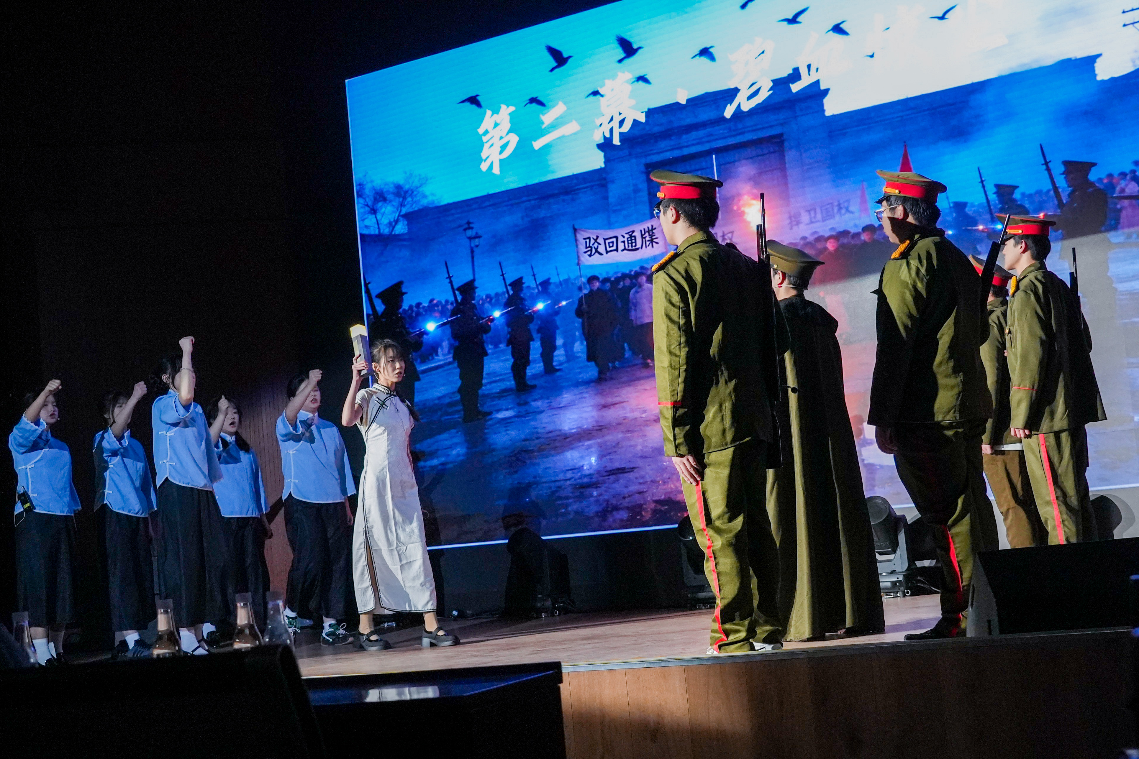 真的猛士,敢于直面惨淡的人生,敢于正视淋漓的鲜血。高二学贯的同学们将鲁迅笔下的文字,化作舞台上沉痛而有力的呐喊。刘和珍君的身影,在枪声中倒下,却在民族的记忆里永生。“都是为你好”——这句话,是爱,还是枷锁?高二(7)班的同学们用一出心理剧,让父母与孩子在舞台上坦诚相对。那些未曾说出口的委屈,那些被误解的深情,在灯光下交汇、和解。长老说山神怒目,不可逾越。高二(9)班的同学们追随先行者的脚步走出山谷,探索未知。发现原来山谷困住的不是脚步而是目光。烽火燃尽古城,屠刀悄然举起。民族危亡之际,一群热血少年挺身而出。高二(2)班的同学用真相叩响世界,只为守护同胞、铭记国殇。暗无天日的角落,女工的苦难,在舞台上被一寸寸剖开——是鞭痕,是压榨,是旧时代吃人的沉默。可高二(1)班的同学们不曾低头。当压迫到达极限,那双早已伤痕累累的手,终于握成了拳。冬夜,高二(18)班的学生为改成绩向老师索要钥匙。温情背后,是一场道德与功利的博弈。这场演出叩问着每个教育者与受教育者:有些底线,永远不能逾越。朱门深锁,夜未央。华灯之下,是暗流涌动的困局;锦绣之中,是身不由己的命运。四班的同学们演绎了一场关于选择与代价的悲歌。浮华背后,是困兽犹斗的灵魂。一对银烛台,照亮了黑暗中迷途的灵魂。高二(17)班将烛光点亮,那个曾经被世界抛弃的人,终于学会了如何爱人。原来,救赎不是审判,而是一束愿意照亮别人的光。黎明前的至暗时刻,有人选择沉默,有人选择逃离,高二(11)班的同学们,选择点燃。一群师生在黑暗中围坐,每一页翻过的纸张,都是对愚昧的抵抗;每一次低声的诵读,都是对光明的呼唤。疏影横斜,暗香浮动;水清浅处,光影徘徊。曾经隔海相望的身影,在围巾、黄葛树下和信间消散。高二(8)班的同学坚信,会再相逢必有期,常怀信念终无憾。