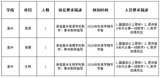2026年秋季学期我校计划招募云南省基础教育银龄教师3人,高中英语、地理、生物各1人,岗位需求详见下表。