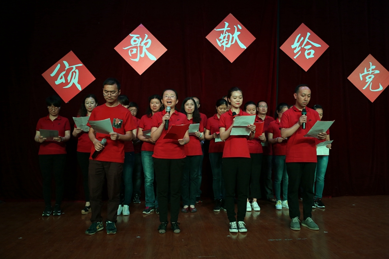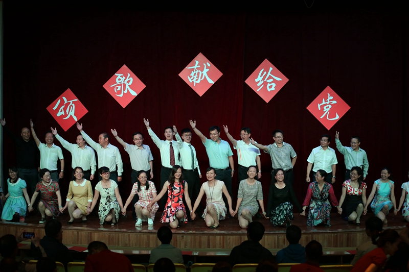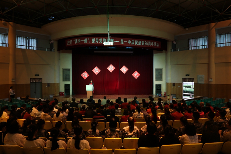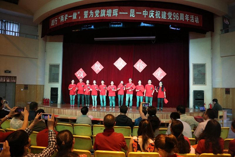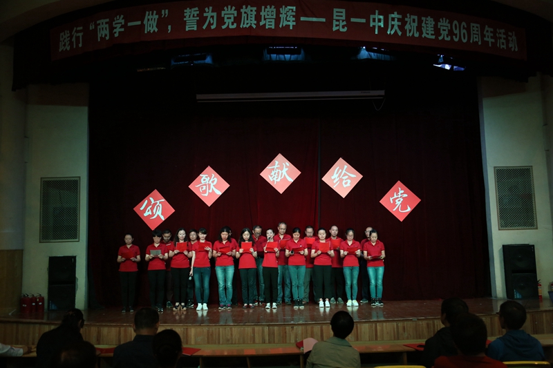 2017年6月29日,“践行‘两学一做’,誓为党旗增辉 ——昆一中庆祝建党96周年活动”在我校报告厅隆重进行。首先举行了优秀党员表彰大会。党委书记高富英宣读了《中共昆明市第一中学委员会关于表彰2017年优秀共产党员的决定》,全体党委委员为受表彰的优秀党员颁发奖状。赵灿东校长随即发表讲话,赵校长希望全体党员以高三支部党员为榜样,继续发挥模范带头作用,为昆一中的新百年积极作出贡献。简短的表彰大会后,各支部进行了文艺表演。整场演出围绕社会主义核心价值观,节目丰富多彩,形式多样。高一支部率先带来大合唱《大中国》,嘹亮恢弘的歌声展示出我们走向中华民族伟大复兴之路的昂扬姿态和坚定步伐,独唱《我的未来不是梦》将现场气氛推向了高潮;高二支部铿锵有力的朗诵《我的梦》和大合唱《我们走在大路上》,更是淋漓尽致地展示了高二支部老师们作为新时代党员的蓬勃生机与活力;高三支部老师们的节目《东方之珠》、《长江之歌》真切地诉说了他们对于党对于祖国的爱与崇敬。由业余党校学员表演的《律动青春》和《迷彩青春》,向老师和同学们展现了他们作为祖国未来希望的无限青春活力。整场演出在行政支部活泼的《我相信》和深情的《共和国之恋》中落下帷幕!