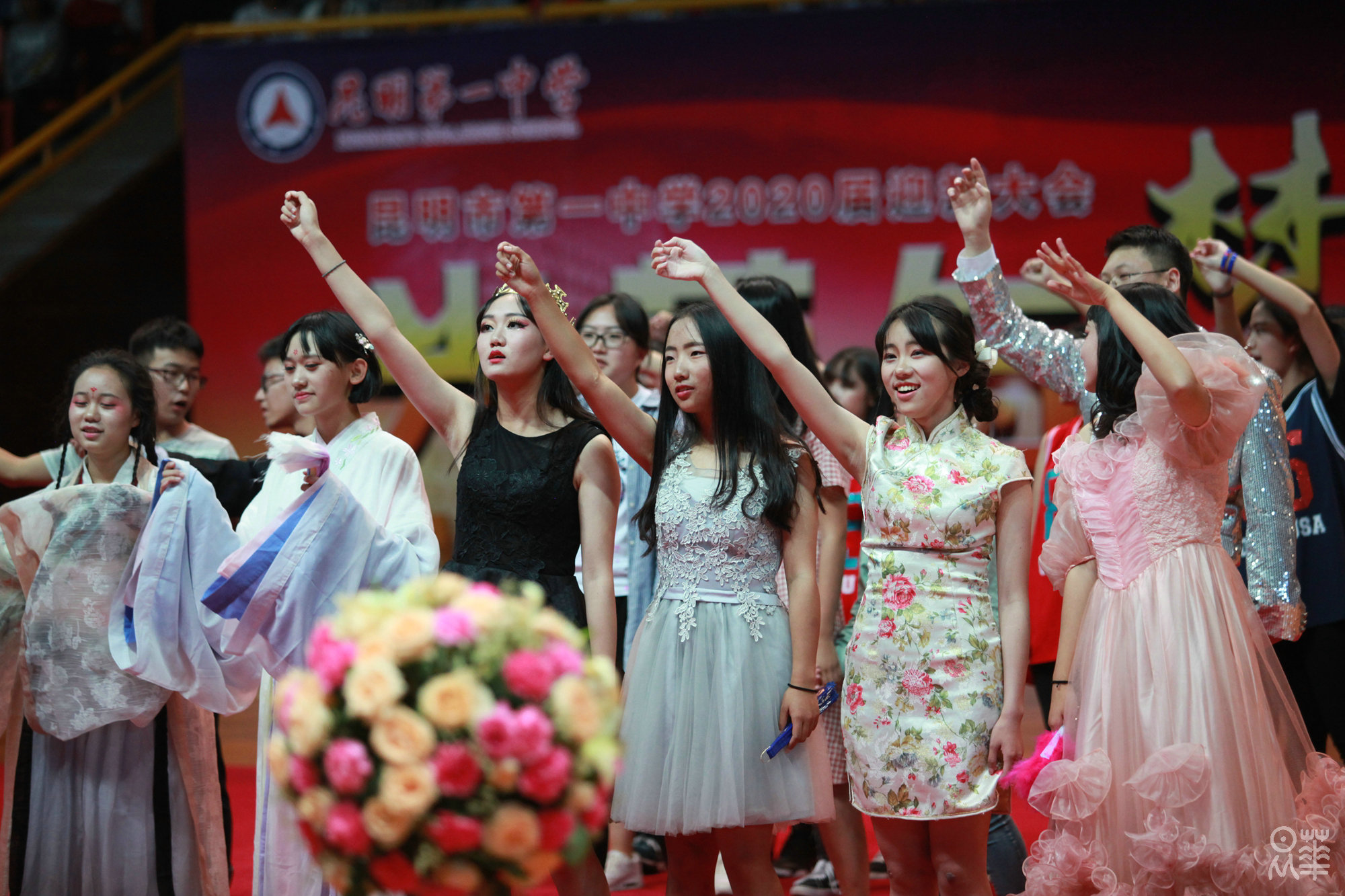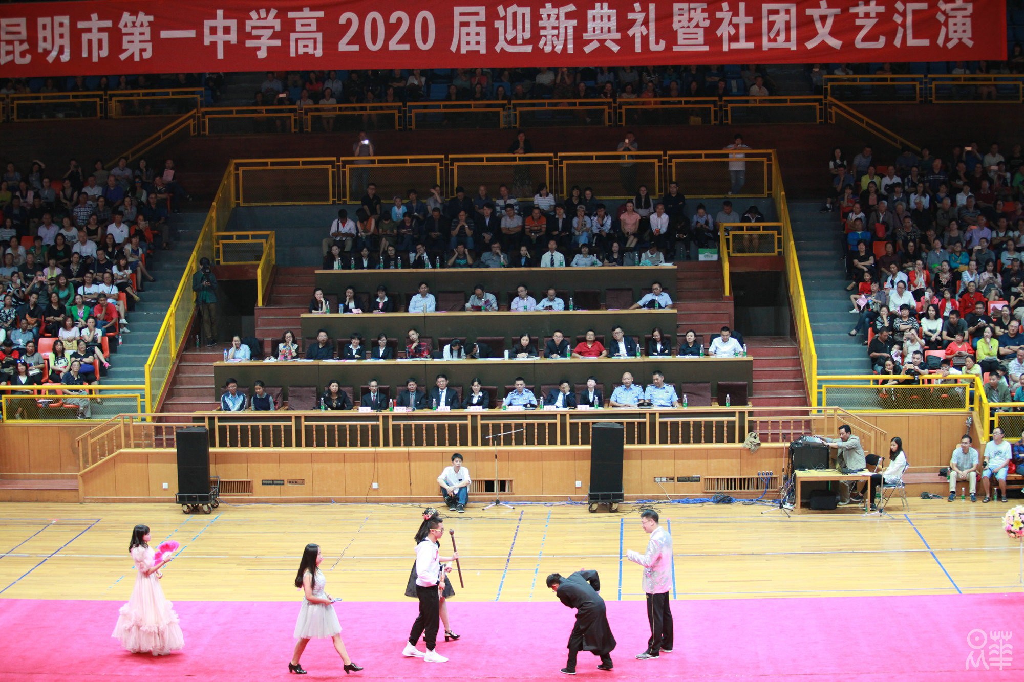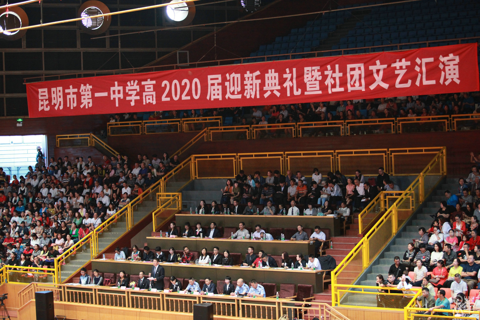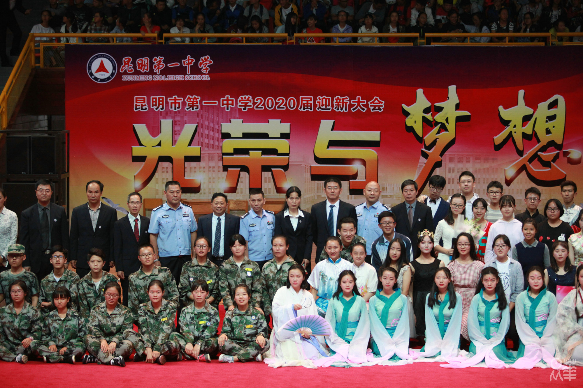 (文字:新闻社管静)正是夏末秋初时节,昂着朝气的脸庞,2020届新生正式开始了在昆华园的学习生活。8月27日下午,我校于市体育馆举行了2020届迎新典礼暨社团文艺汇演。赵校长和年级组长杨建萍老师的致辞,使同学们对一中有了更深刻的了解。杨习志、沈涛两位老师演唱的《一生有你》,白色衬衫和牛仔裤,清亮而不失韵味的嗓音,掀起了文艺汇演的第一个高潮。紧接着,在一中活跃了28年之久的学生社团——军事小组为同学们表演了军体拳和《强军战歌》,利落干净的动作和铿锵有力的歌声赢得了同学们的喝彩。为了迎接2020届新生,参演社团可谓下足了功夫,都希望借这次汇演俘获校小20们的“芳心”,无论是汉服社,武术队或是街舞社,无论是《笙歌》、《武动青春》,亦或是《get out of your mind》,都让新生感受到了昆华园的青春与活力。