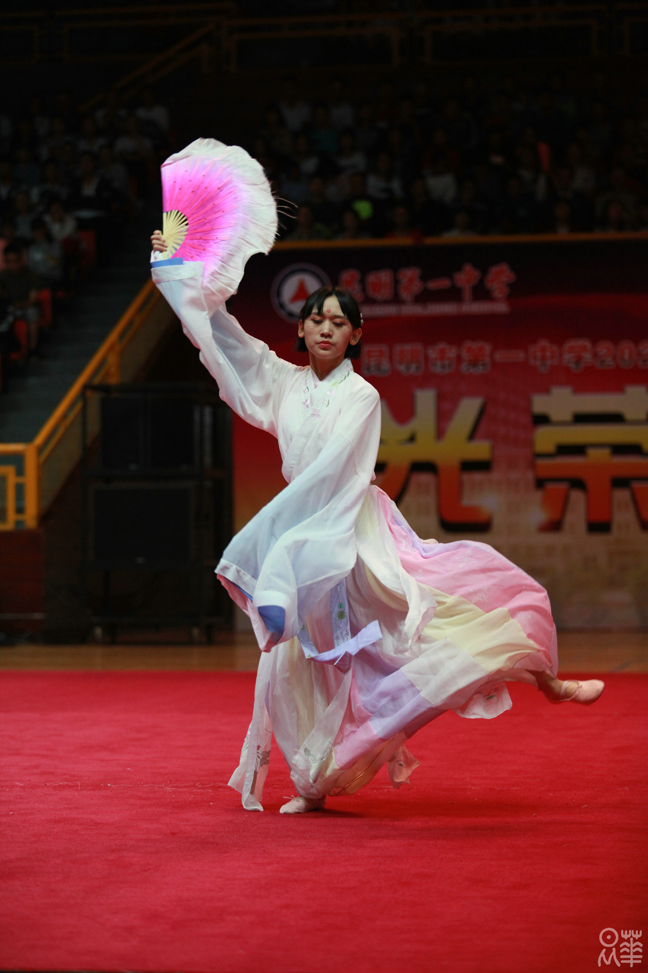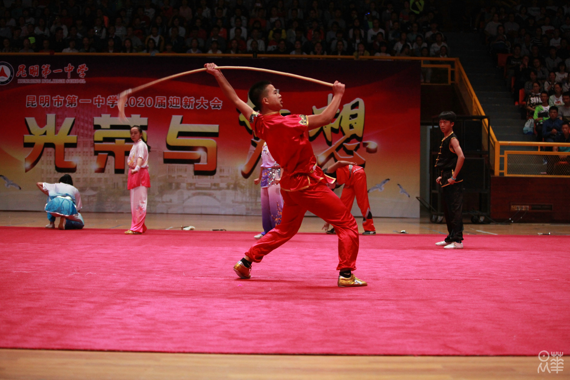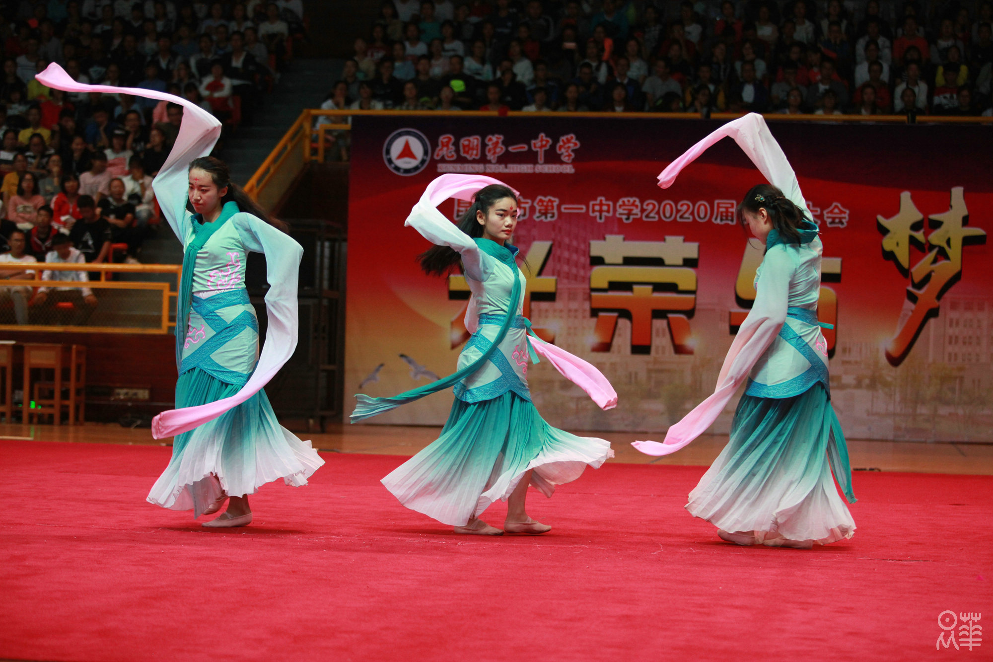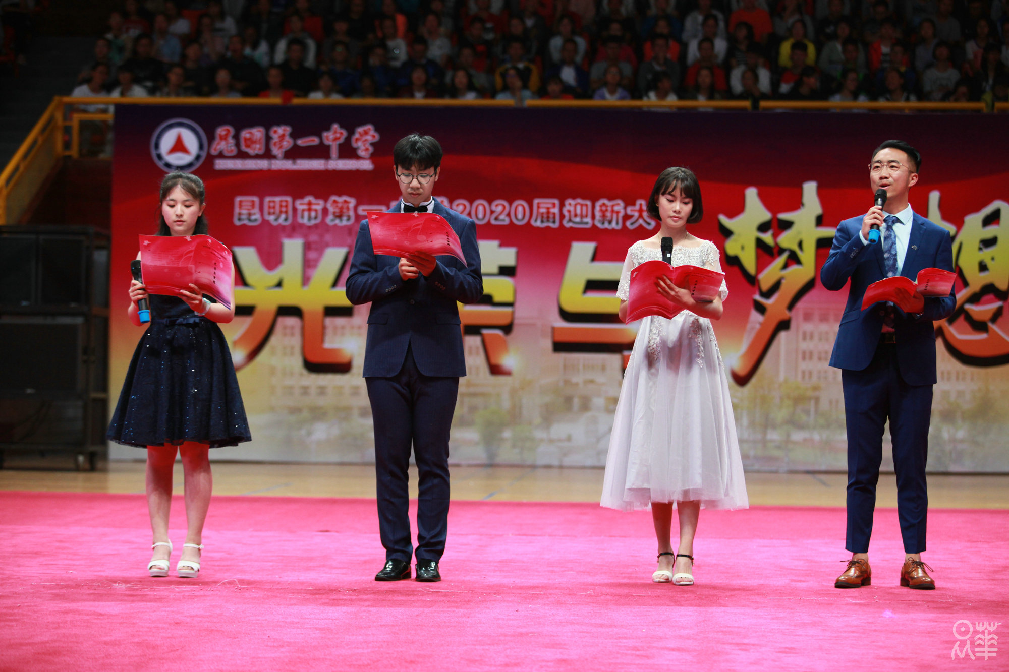 (文字:新闻社管静)正是夏末秋初时节,昂着朝气的脸庞,2020届新生正式开始了在昆华园的学习生活。8月27日下午,我校于市体育馆举行了2020届迎新典礼暨社团文艺汇演。赵校长和年级组长杨建萍老师的致辞,使同学们对一中有了更深刻的了解。杨习志、沈涛两位老师演唱的《一生有你》,白色衬衫和牛仔裤,清亮而不失韵味的嗓音,掀起了文艺汇演的第一个高潮。紧接着,在一中活跃了28年之久的学生社团——军事小组为同学们表演了军体拳和《强军战歌》,利落干净的动作和铿锵有力的歌声赢得了同学们的喝彩。为了迎接2020届新生,参演社团可谓下足了功夫,都希望借这次汇演俘获校小20们的“芳心”,无论是汉服社,武术队或是街舞社,无论是《笙歌》、《武动青春》,亦或是《get out of your mind》,都让新生感受到了昆华园的青春与活力。