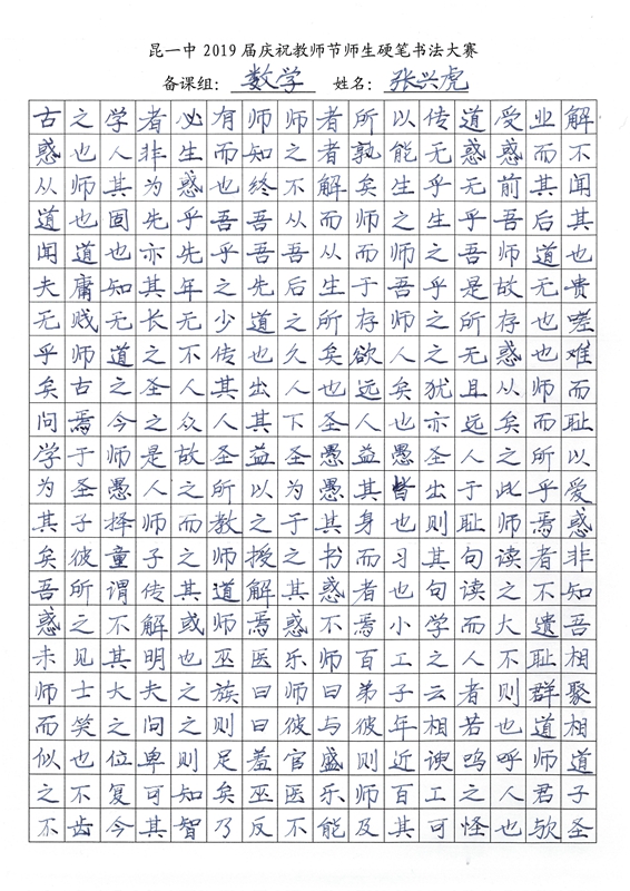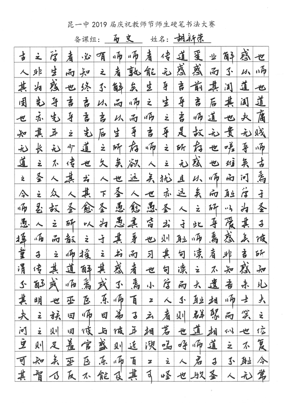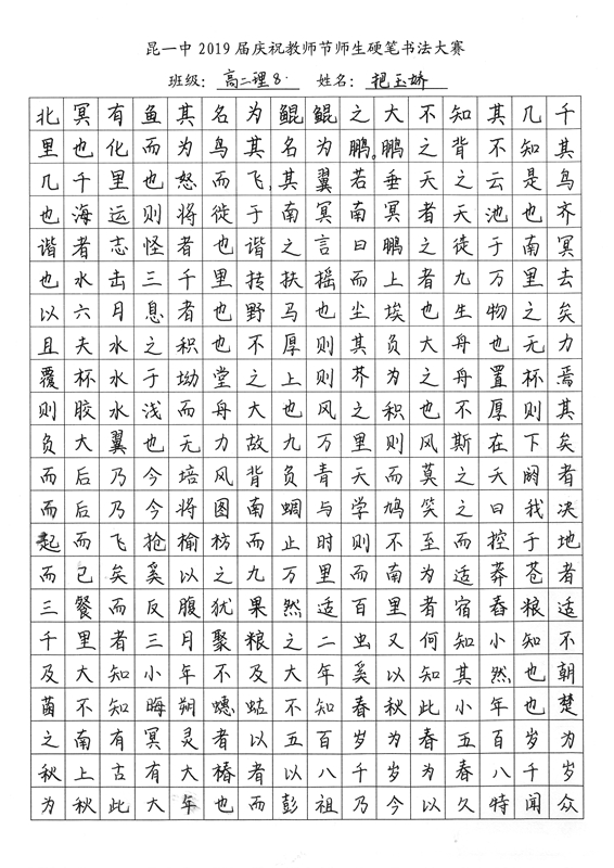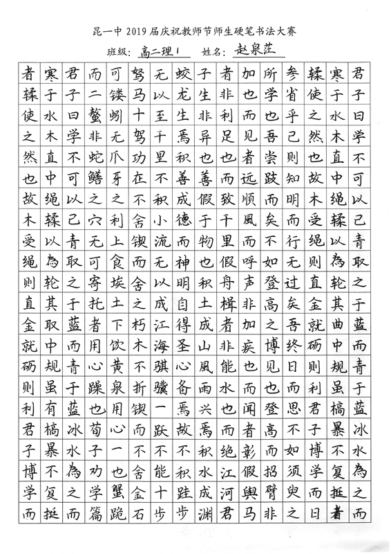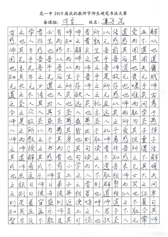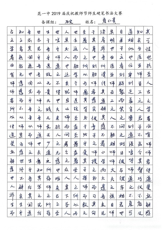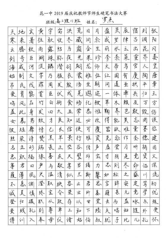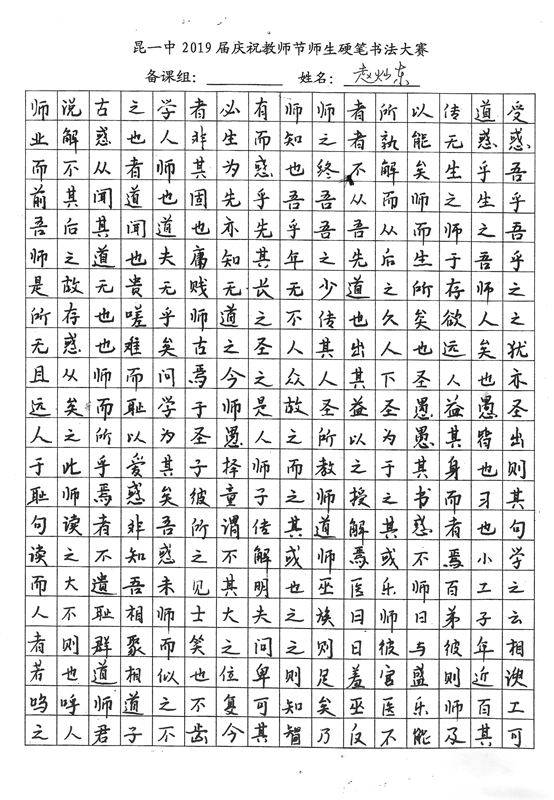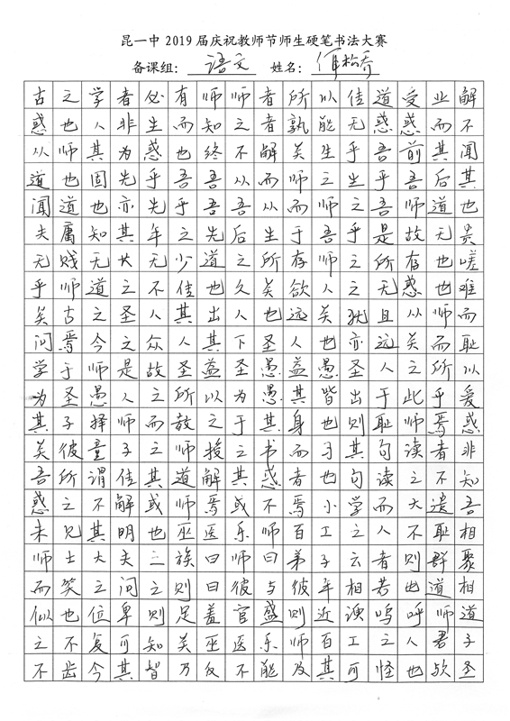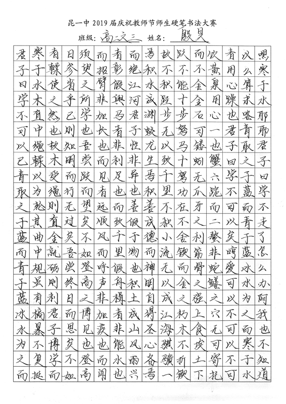 教师节前夕,我校2019届举行了庆祝教师节师生硬笔书法大赛。一撇一捺,一横一竖中,汉字的魅力跃然纸上。一首首诗词,一篇篇散文,由此我们再次感悟问学之道和为师之道,其中亦饱含了同学们对老师深深的感激之情。大大小小,开开合合,下笔成趣,引人欣赏,心畅神怡。或笔酣墨饱,或遒劲有力,或饱满圆润,都可以称得上是气韵生动。在这样一次别具一格的活动中,我们不仅传承了传统的汉字文化,还提升了硬笔书法的能力,而师生共同参与的形式,更让同学们领会到了教师节别样的意义——与师为友,其乐融融。(文字:新闻社梅颖怡)